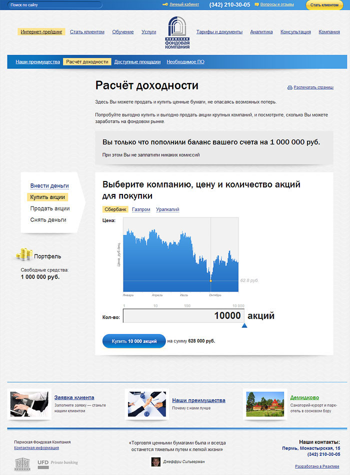 Описали механизм работы на фондовом рынке. Разработали «Калькулятор доходности» для расчета возможного дохода. Сделали форму заявки для новых клиентов. Дали информацию о семинарах и сделали форму регистрации на них.