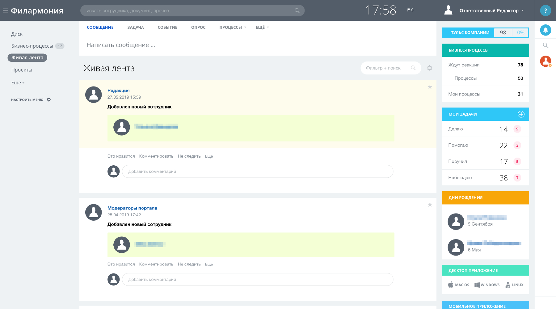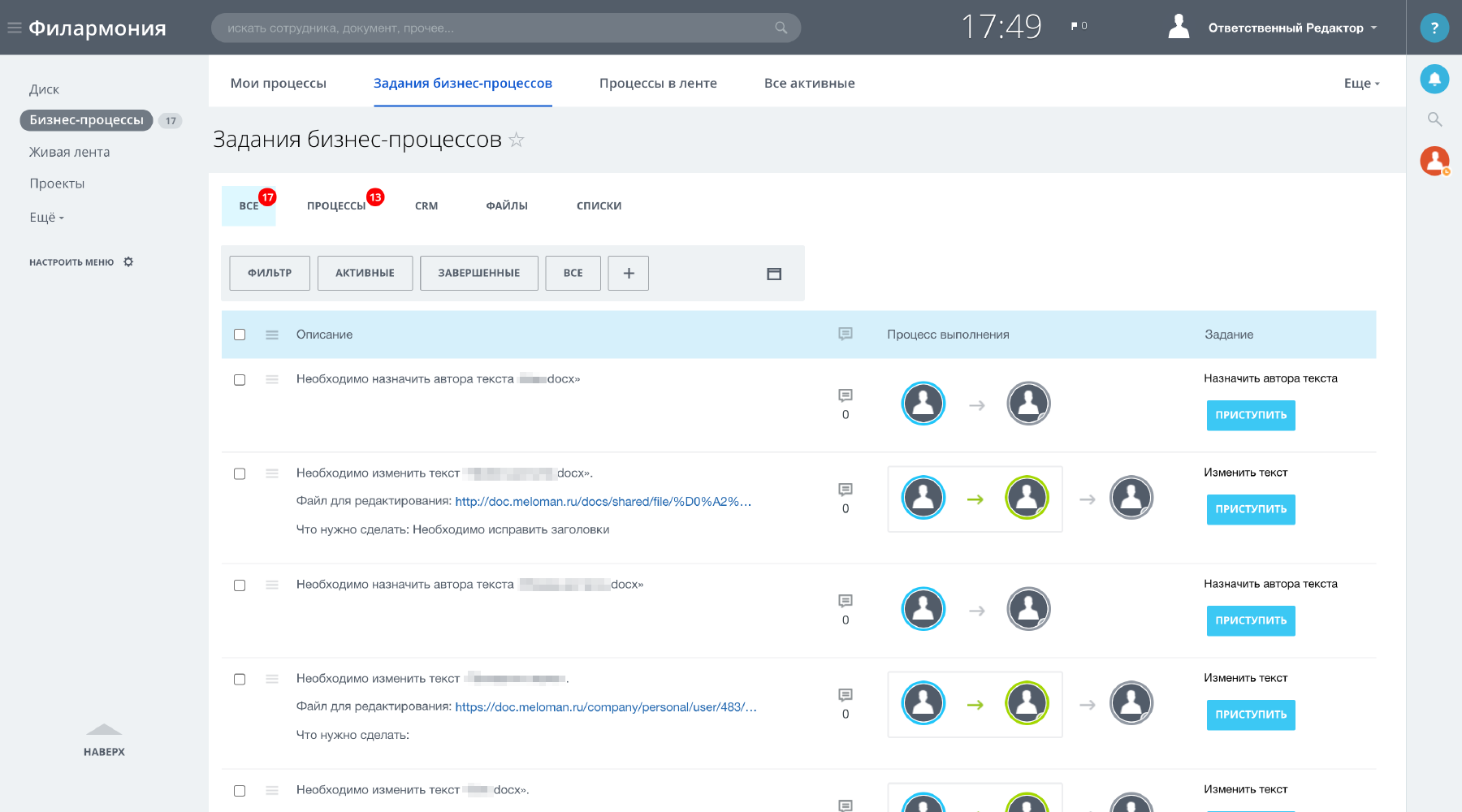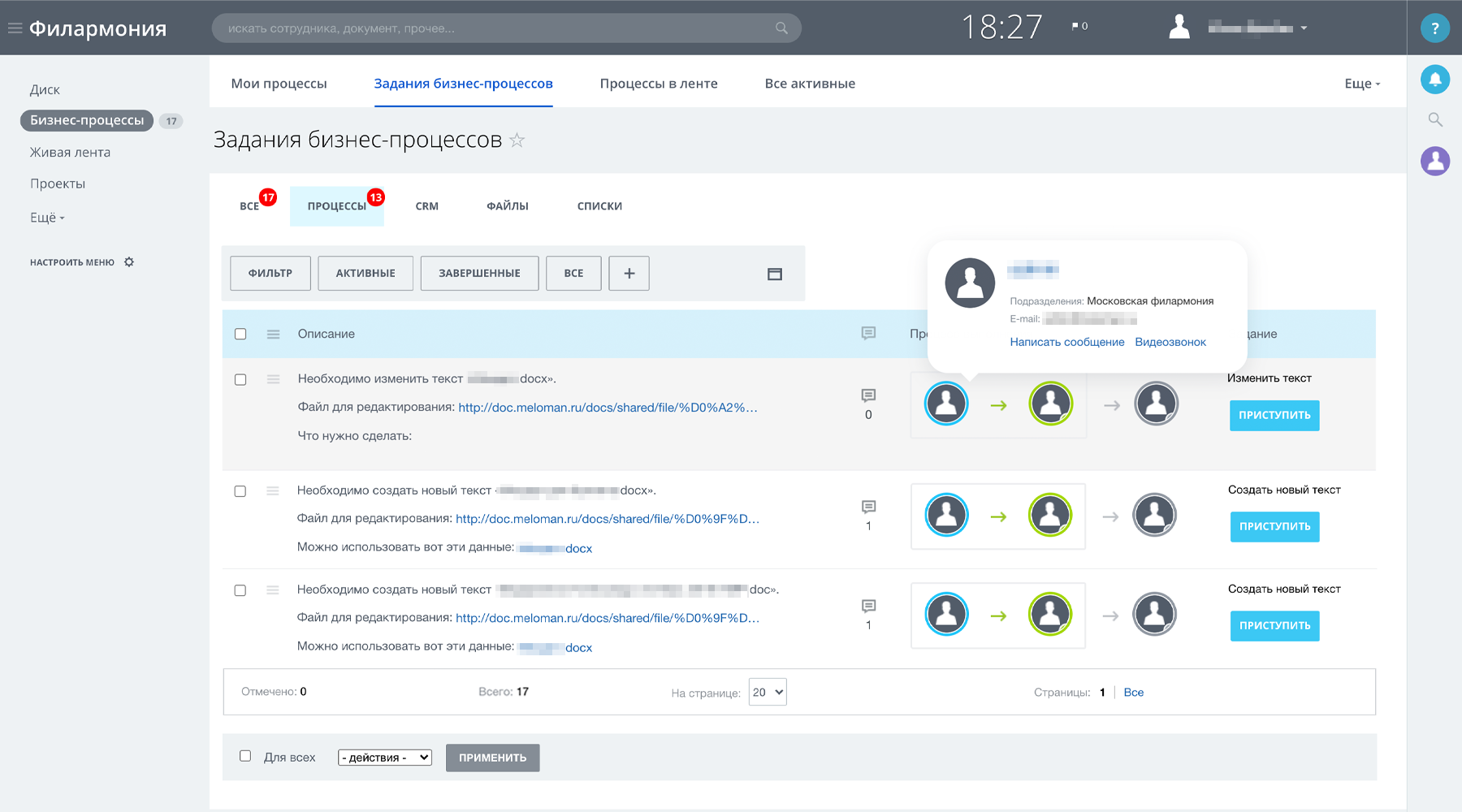 Когда система была готова, наш менеджер провел обучение персонала. Оно проводилось на территории клиента — в кабинетах Московской филармонии. Для культурной среды непривычны инструменты автоматизации, поэтому было много вопросов, и потом — долгое привыкание. Например, в «Битрикс-24» есть термин «бизнес-процесс». Он общепринятый, его невозможно переименовать. Когда редакторы услышали это слово, последовала реакция: «Какой бизнес, какой бизнес-процесс? Мы же филармония!»