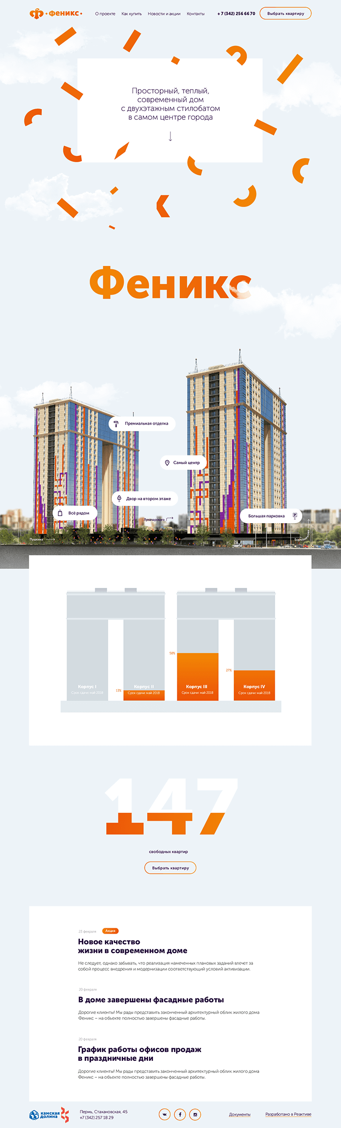 Разработать яркий промо-сайт строящегося жилого комплекса в центре Перми.