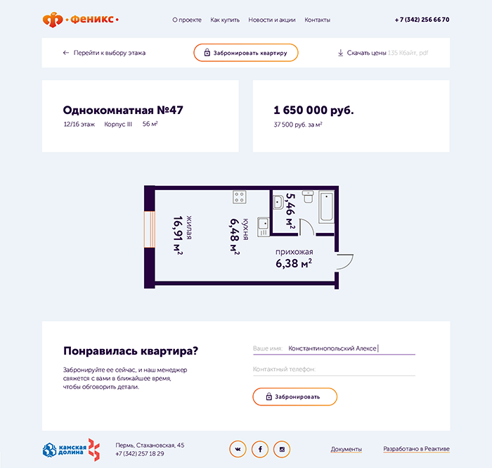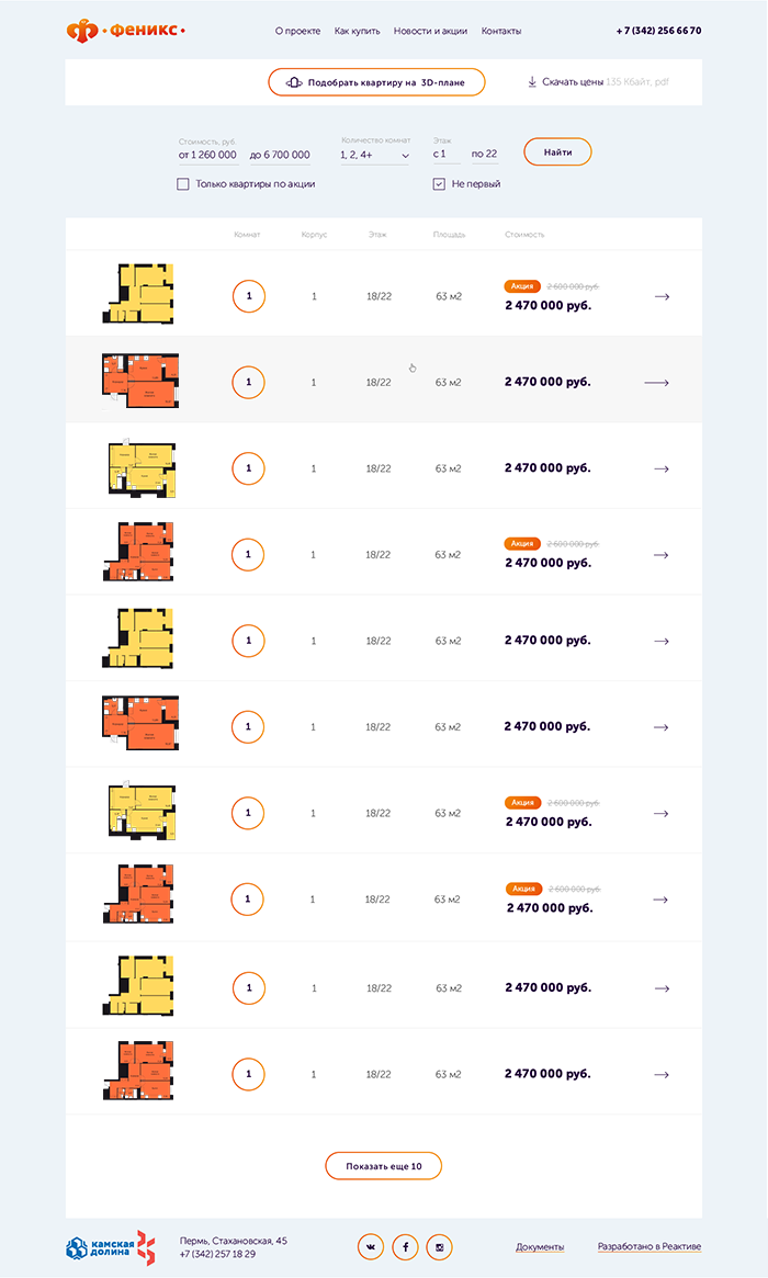 На сайте реализован удобный выбор квартиры по множеству параметров с помощью табличного вида или 3D-плана. Выбранную квартиру можно забронировать оставив заявку для менеджера по продажам.