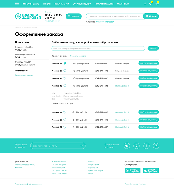 Добавить товар в корзину легко, но нажимая на специальный значок, пользователь даже не представляет, насколько серьезный процесс запускается в скрытой части сайта. Наличие и остатки товара проверяются во всех аптеках выбранного города. Если товаров в корзине несколько, такая проверка происходит для каждого из них. Проверяется также рецептурность и особенности хранения. Все аптеки в списке и на интерактивной карте ранжируются по наличию товаров в корзине: выше отображаются те, где можно забрать весь заказ полностью.