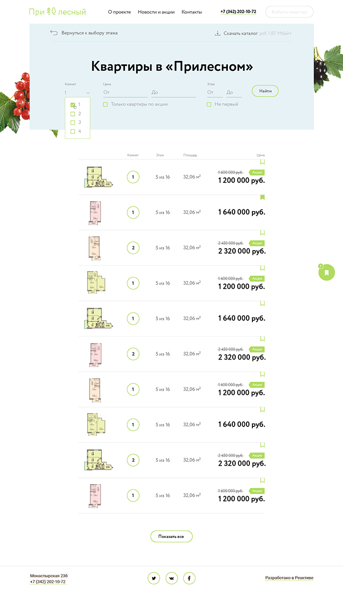 Наличие квартир, статус и цены обновляются через xls-файл. Реализован удобный выбор квартиры по множеству параметров. Выбранную квартиру можно забронировать оставив заявку для менеджера по продажам. Если клиент хочет принять решение позже у него есть возможность скачать каталог квартир в pdf.