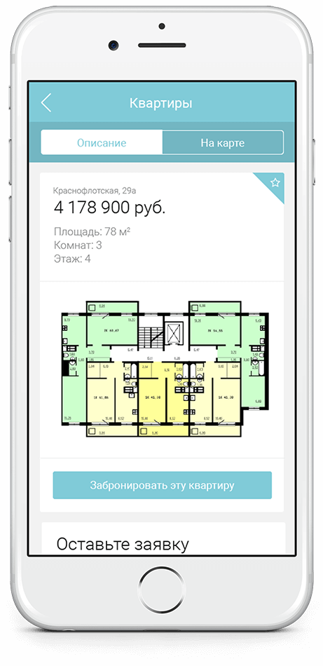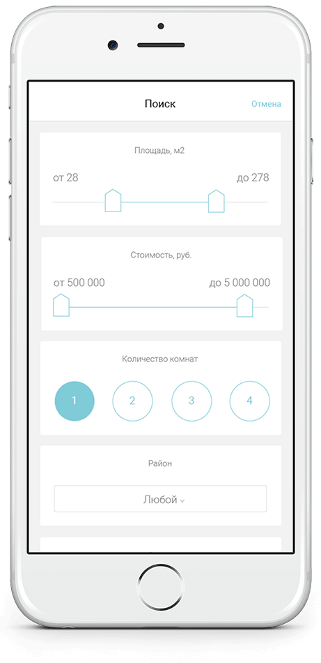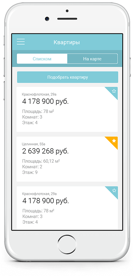 Все объекты сразу можно увидеть на карте. Выбор квартиры удобный и простой для пользователя с мобильным устройством. Знакомые фильтры с параметрами района, количества комнат, стоимости и площади помещения выдают пользователю полный список доступных для покупки квартир.