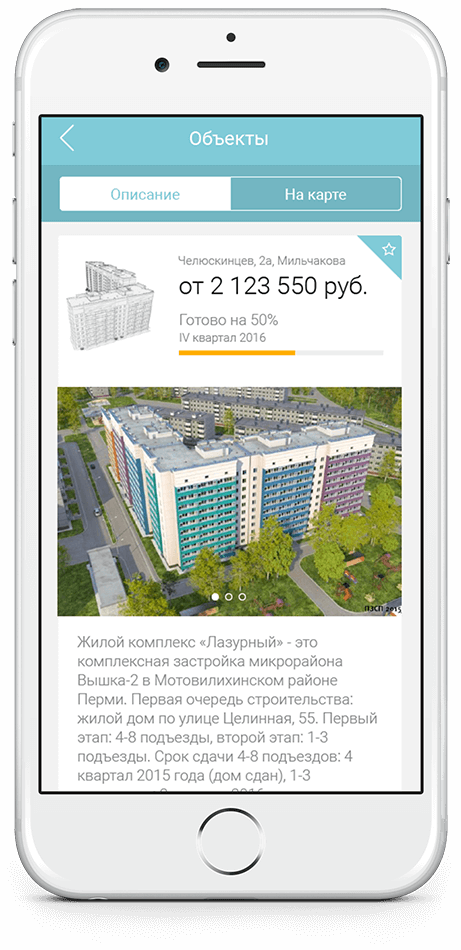 Приложение решает сразу несколько задач. Прежде всего, оно позволяет пользователям следить за проектами компании и видеть полную информацию о строящихся объектах: мы показываем описание, степень готовности, стоимость квартир, расположение на карте, проектную документацию, фотографии хода строительства — все то, что так важно и нужно человеку при принятии решения о покупке квартиры.