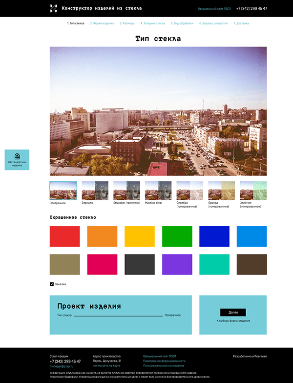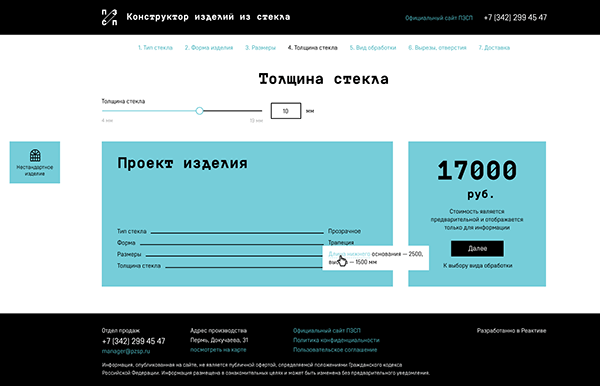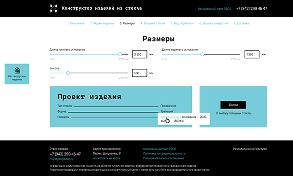 В мире нет ничего универсального. Готовое решение не может подойти каждому. Не стоит отчаиваться, если вам не подходит изделие из стекла, ведь есть компания ПЗСП, а у компании есть собственный цех по производству стеклянных изделий. Более того, теперь у них появился еще и новенький онлайн-конструктор, с помощью которого можно не только создать свой собственный проект, но и узнать примерную стоимость его изготовления.