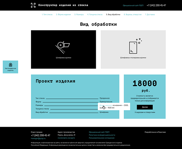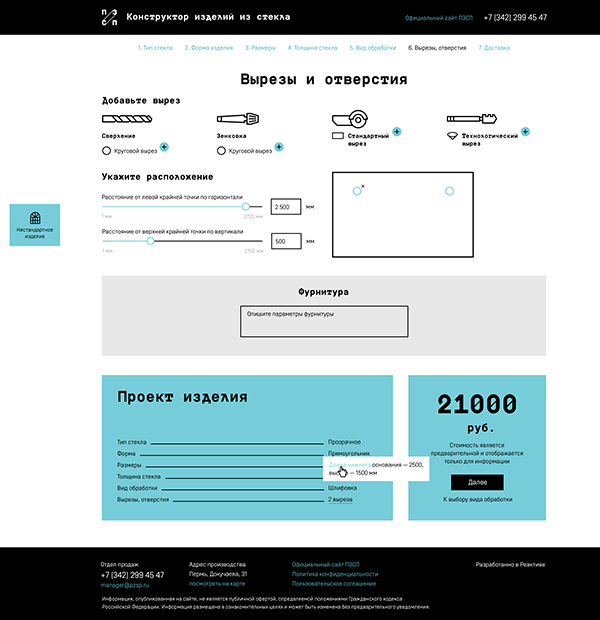 Процесс создания проекта разбит на последовательные этапы: выбор типа стекла, формы изделия, его размеров, видов обработки, необходимости добавить вырезы и отверстия. Пользователь движется по шагам, добавляя к уже выбранным характеристикам новые, уточняя и дополняя деталями модель своего изделия.