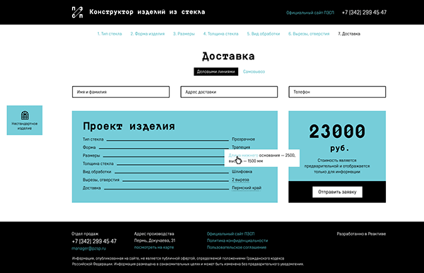 Результатом творческого процесса является готовый проект изделия, который можно отправить в ПЗСП. Примерная стоимость уже известна, вы будете видеть ее на каждом шаге и изменять, выбирая и убирая различные характеристики. В конце процесса можно даже узнать стоимость доставки.