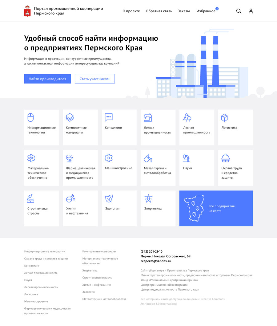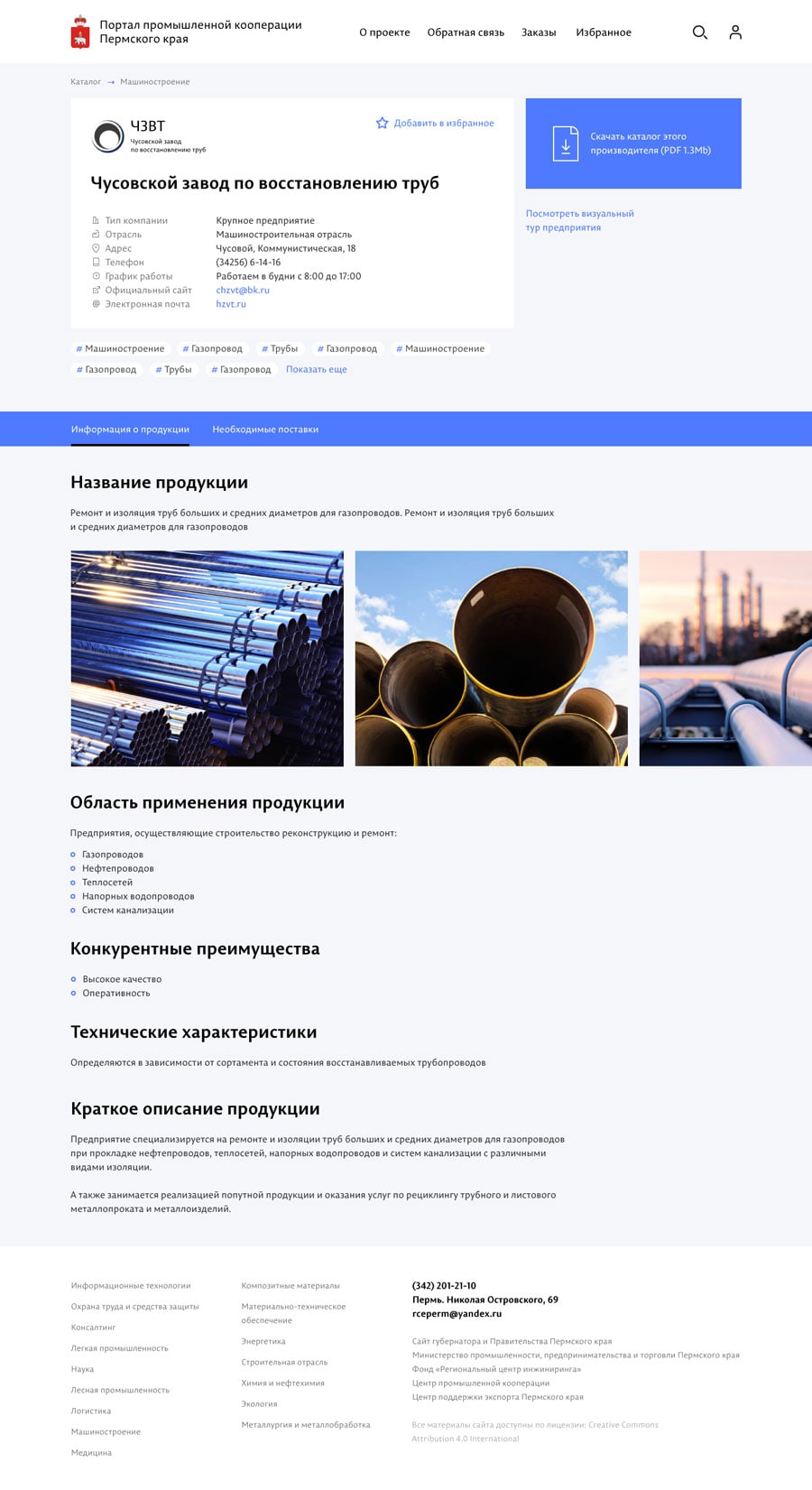 У каждой компании есть карточка предприятия. В ней краткая информация о компании, контактные данные, информация о продукции и конкурентные преимущества. Карточку предприятия можно скачать в формате PDF или добавить в избранное.