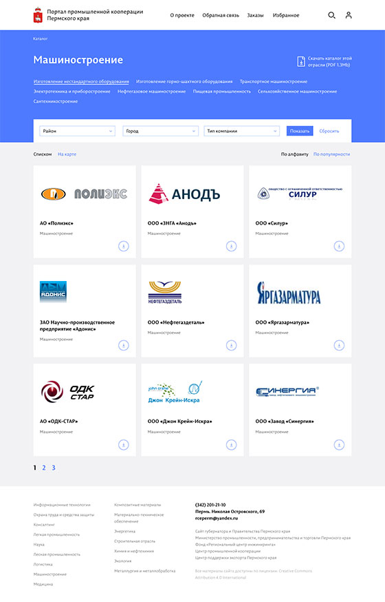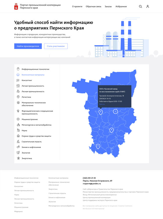 Каталог разделен на отрасли. Нужную компанию можно выбрать из списка, либо найти на карте. Мы учли возможность поиска по профилю компании, географическому положению и тегам. Например, пишете в поиске «шины» и видите все предприятия, которые производят шины.