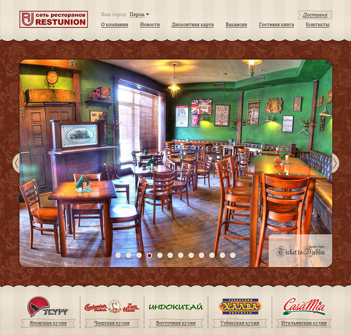 Сеть ресторанов представляющая итальянскую, японскую и узбекскую кухни. В Перми, Тюмени, Уфе и Березниках открыты уютные кафе, экзотические рестораны и веселые ирландские пабы. Что вы любите? Лазанья, кьянти, саке или сливовое вино, острый шашлык из баранины и чай по-узбекски?