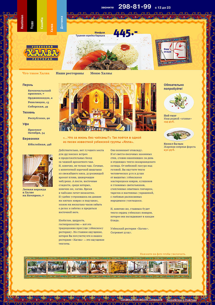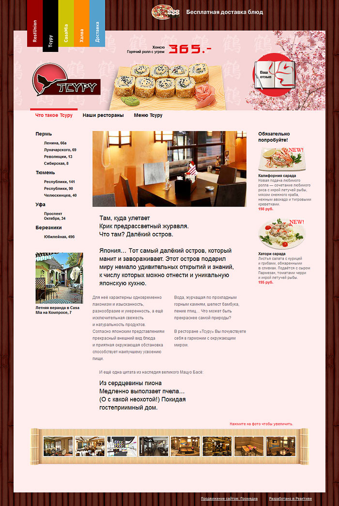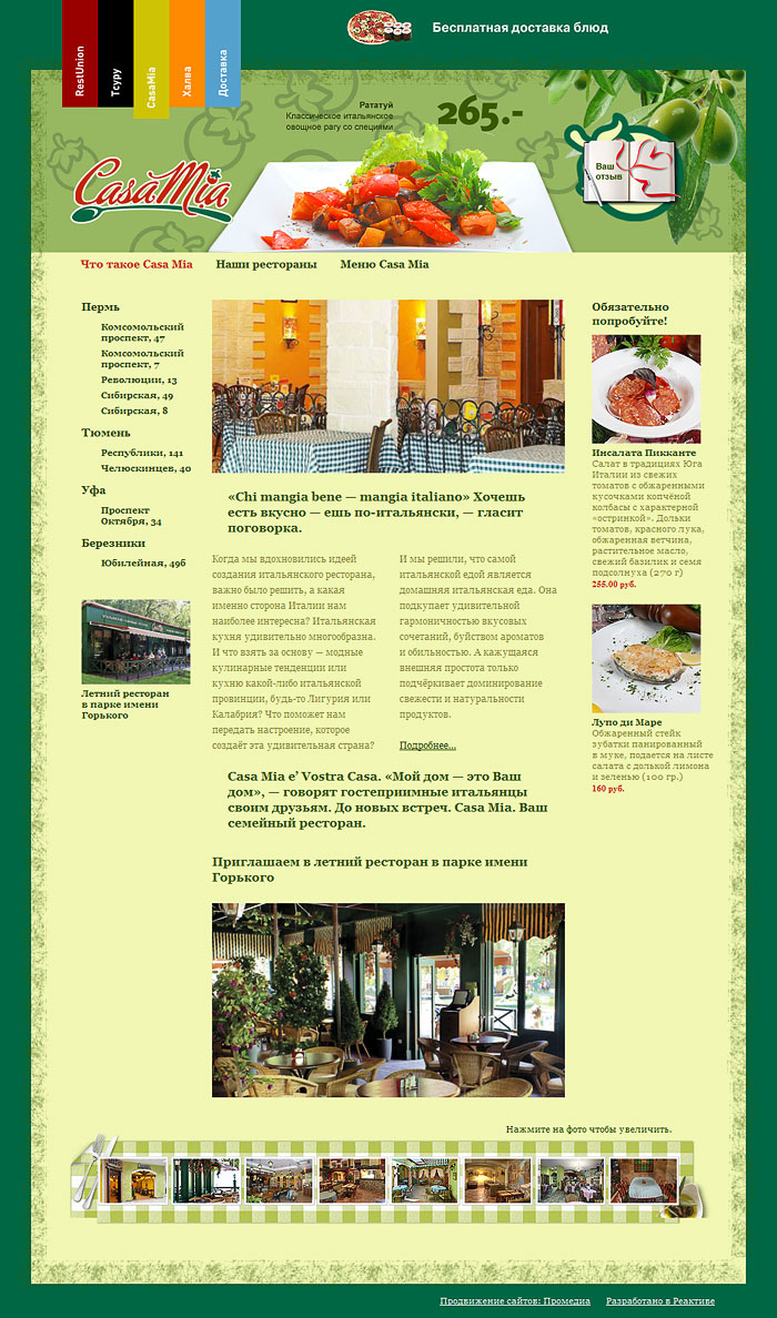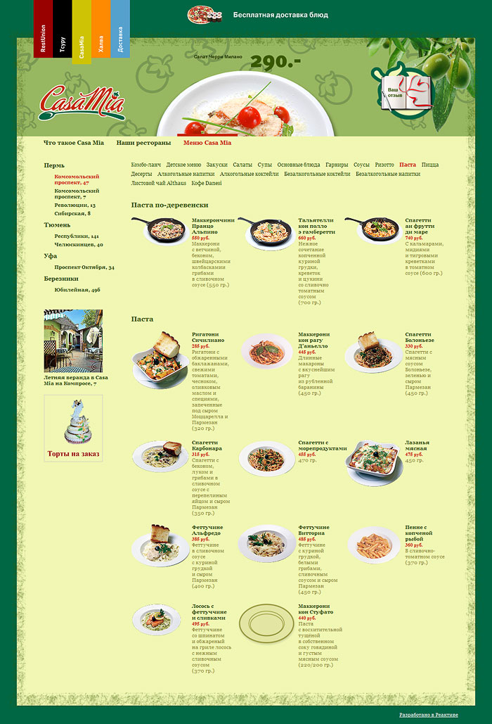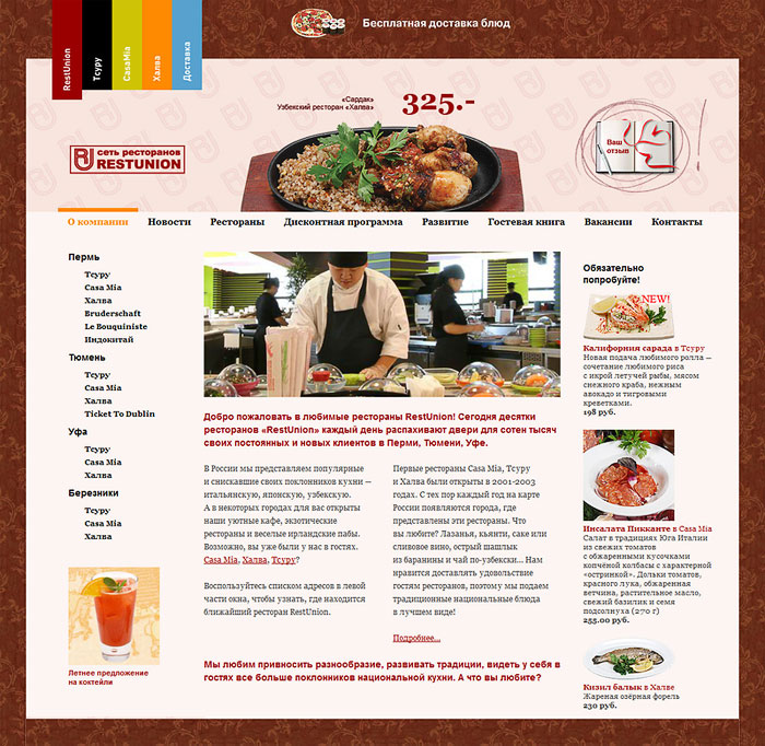 Создан мини-сайт для каждого ресторана. Описание заведения, полное меню, адреса и схемы проезда. Для службы доставки еды открыт отдельный раздел. Выбор блюд и оплата картами.