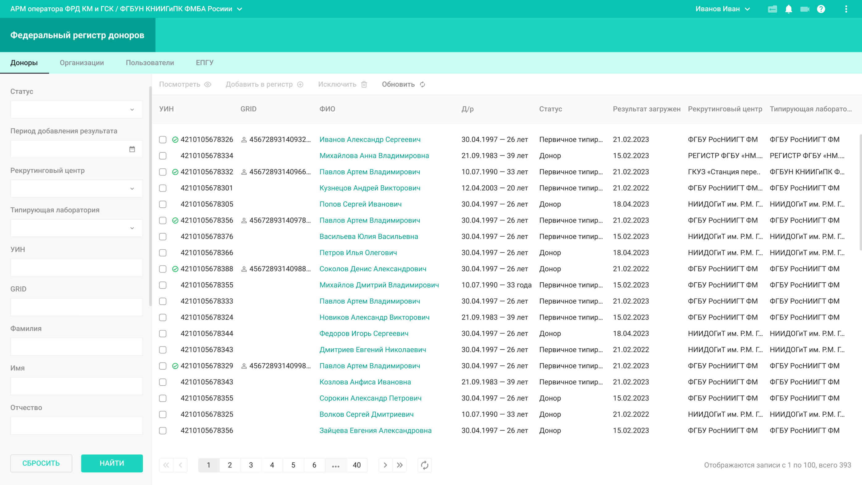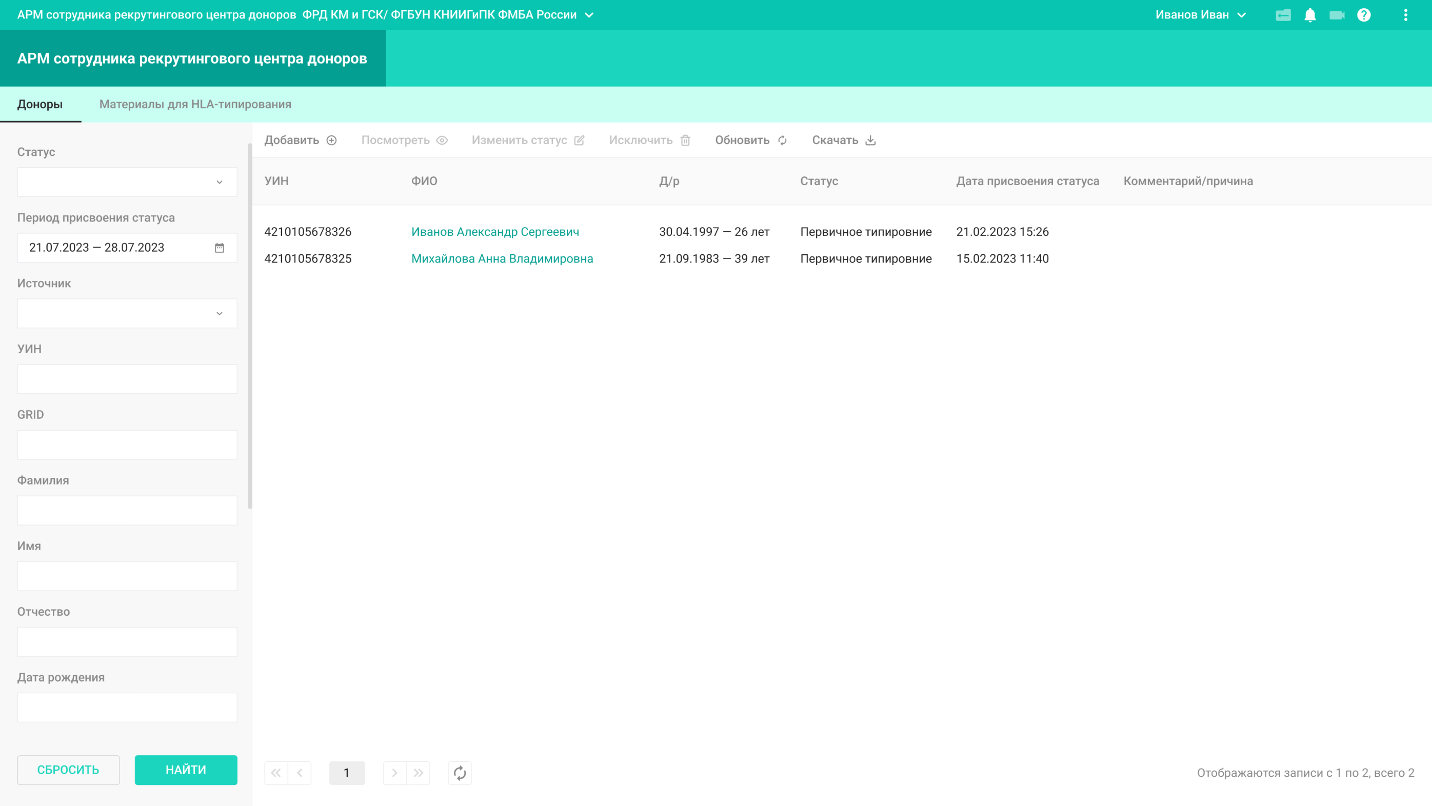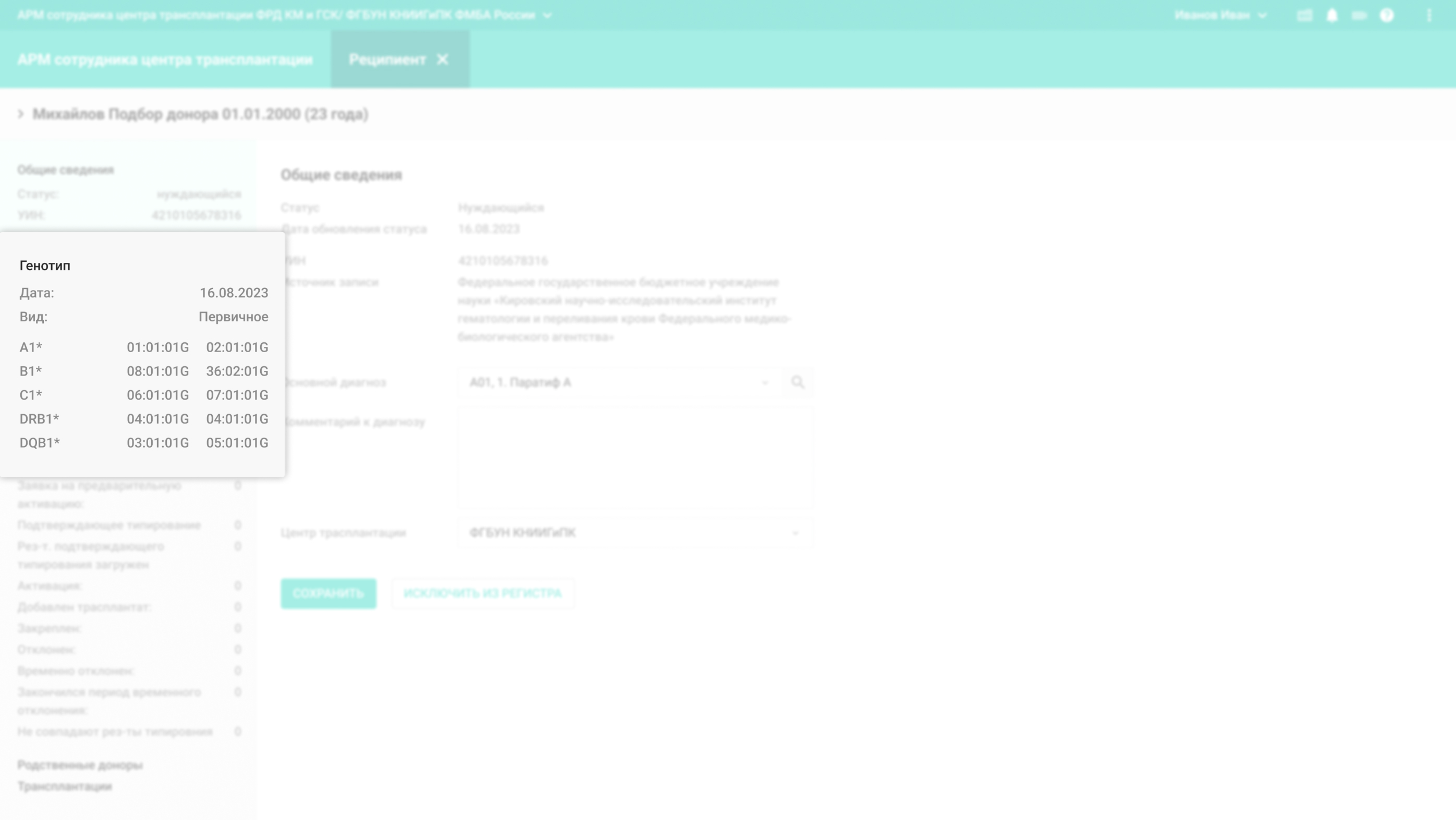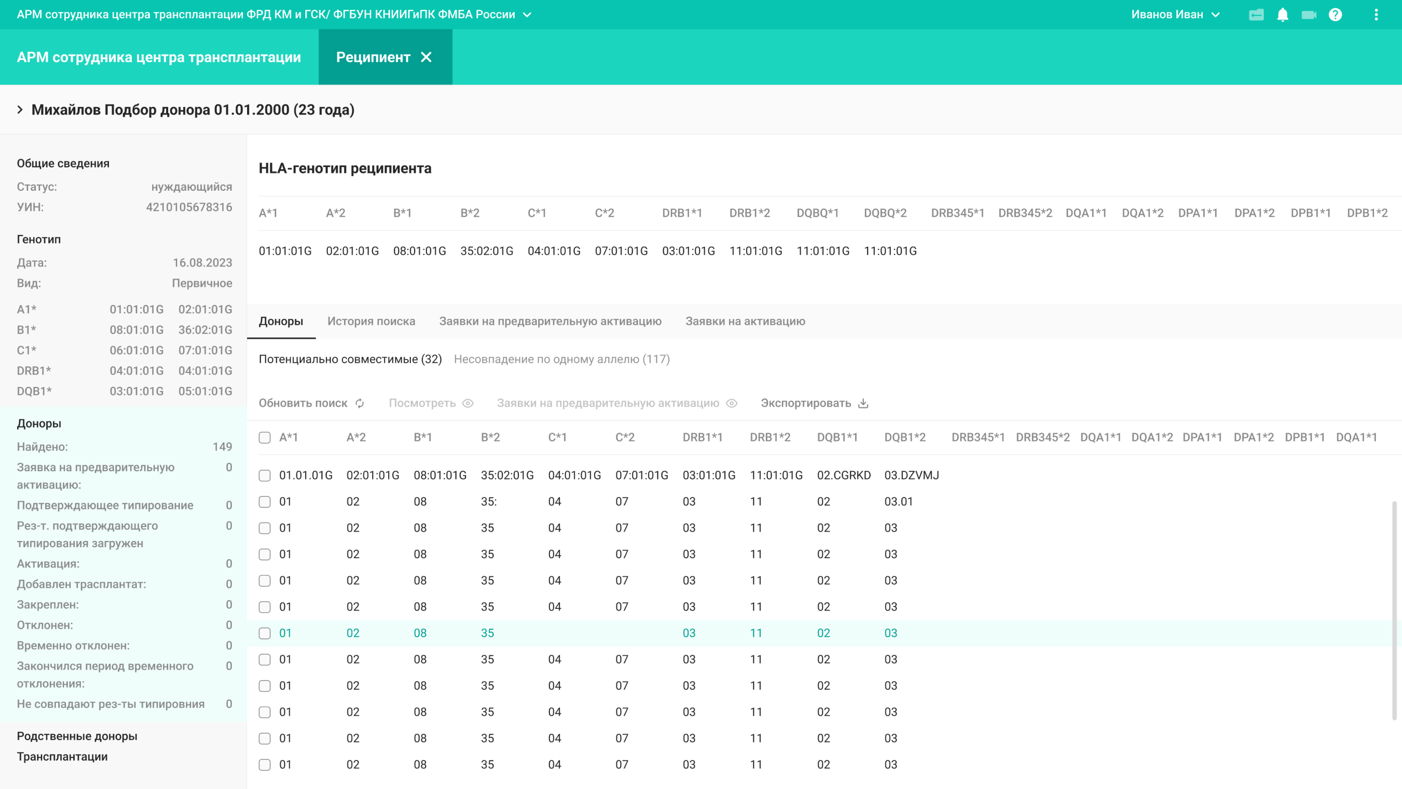 По запросу сотрудника центра трансплантации система выводит список доноров, полностью совместимых по генотипу и с несовпадением по одному аллелю.
