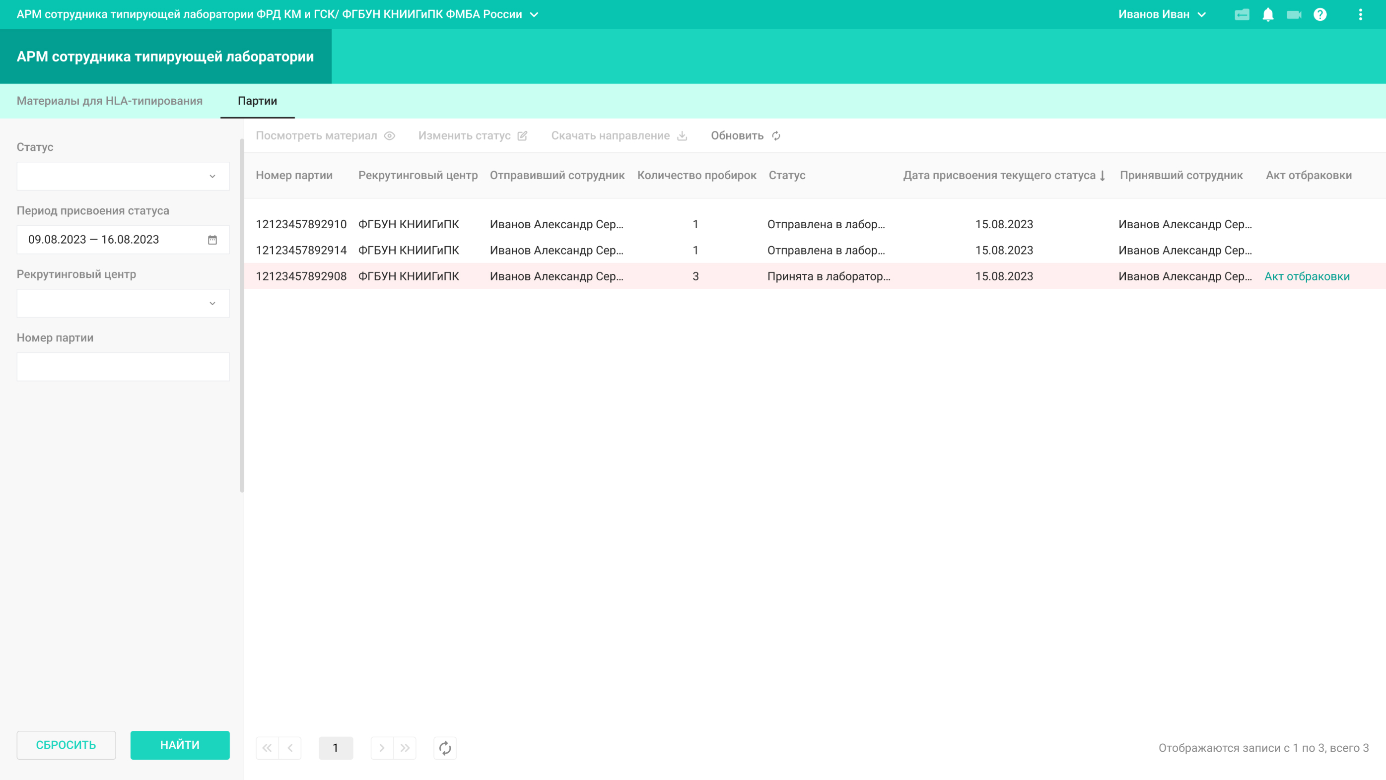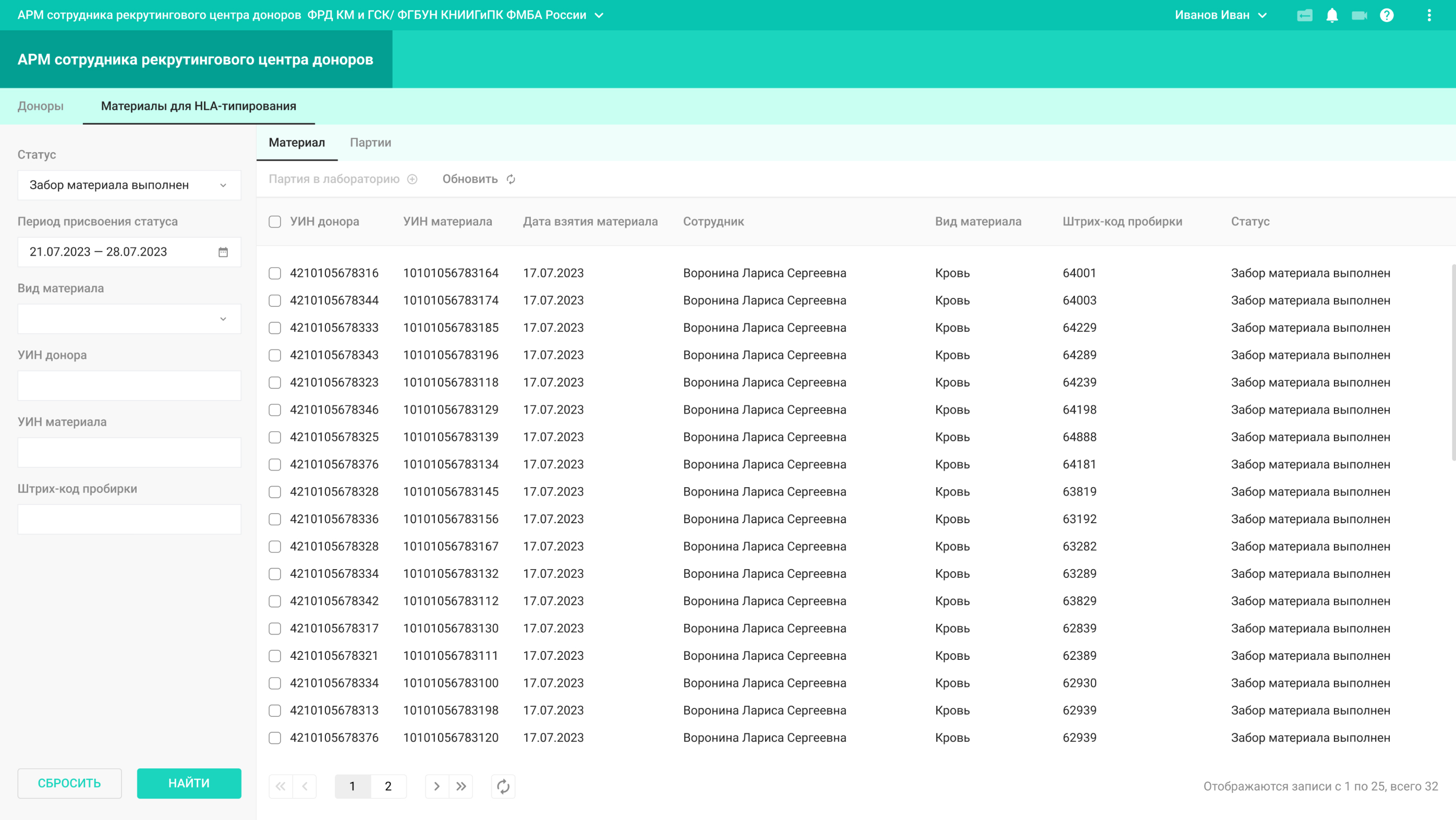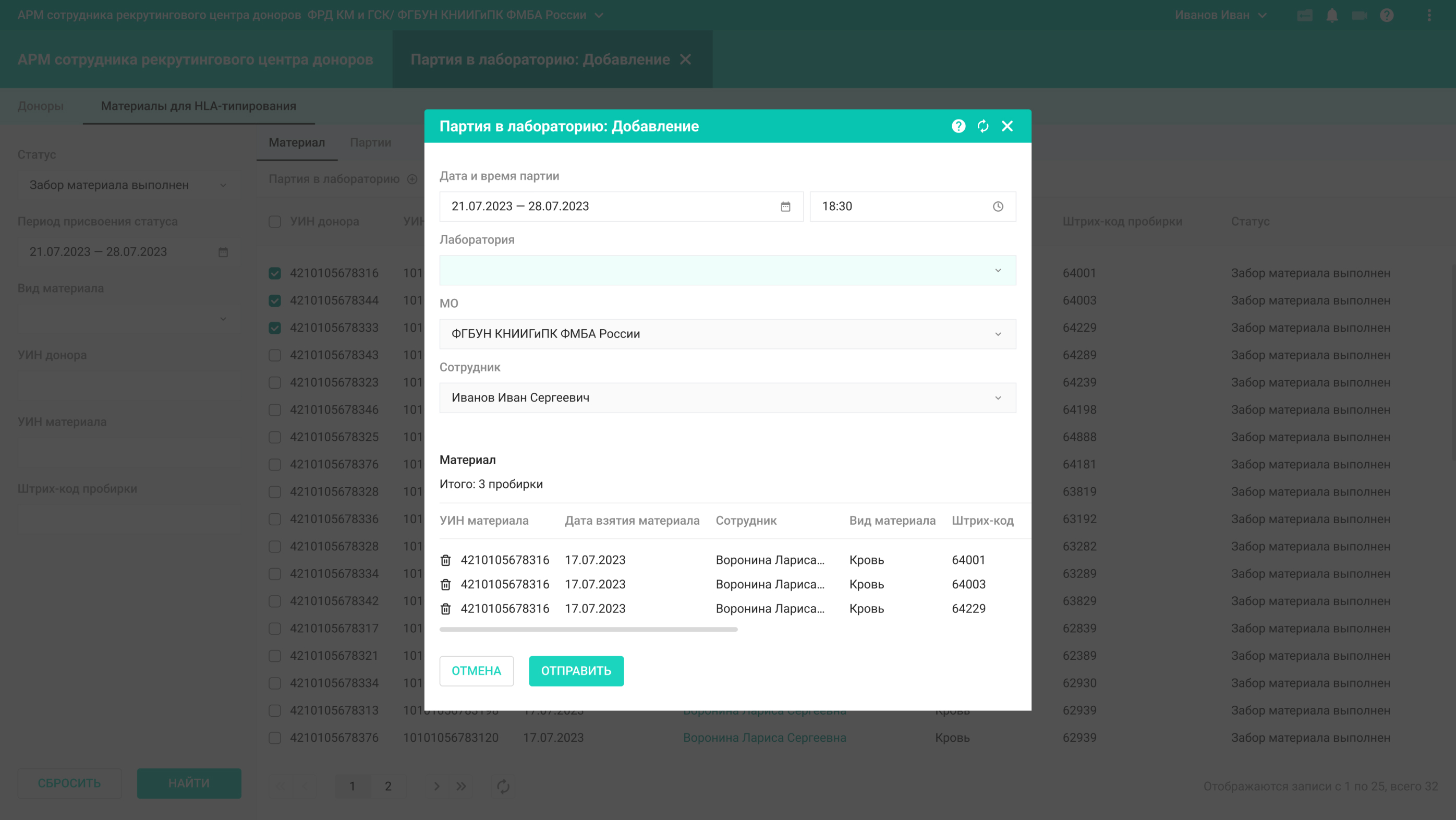 Сотрудники рекрутингового центра проводят забор материала, формируют партии материалов и отправляют их на исследование в типирующую лабораторию.