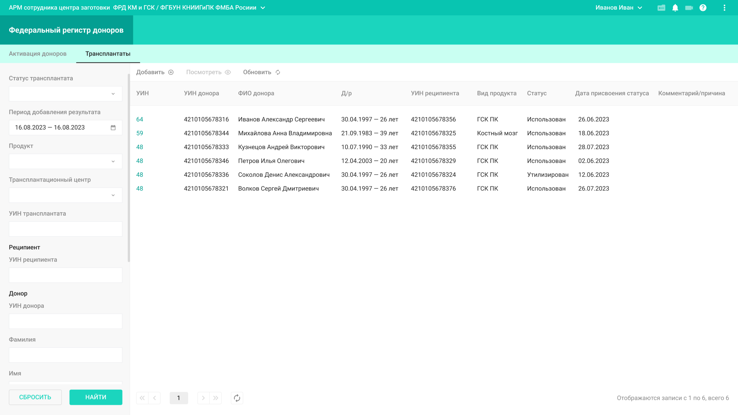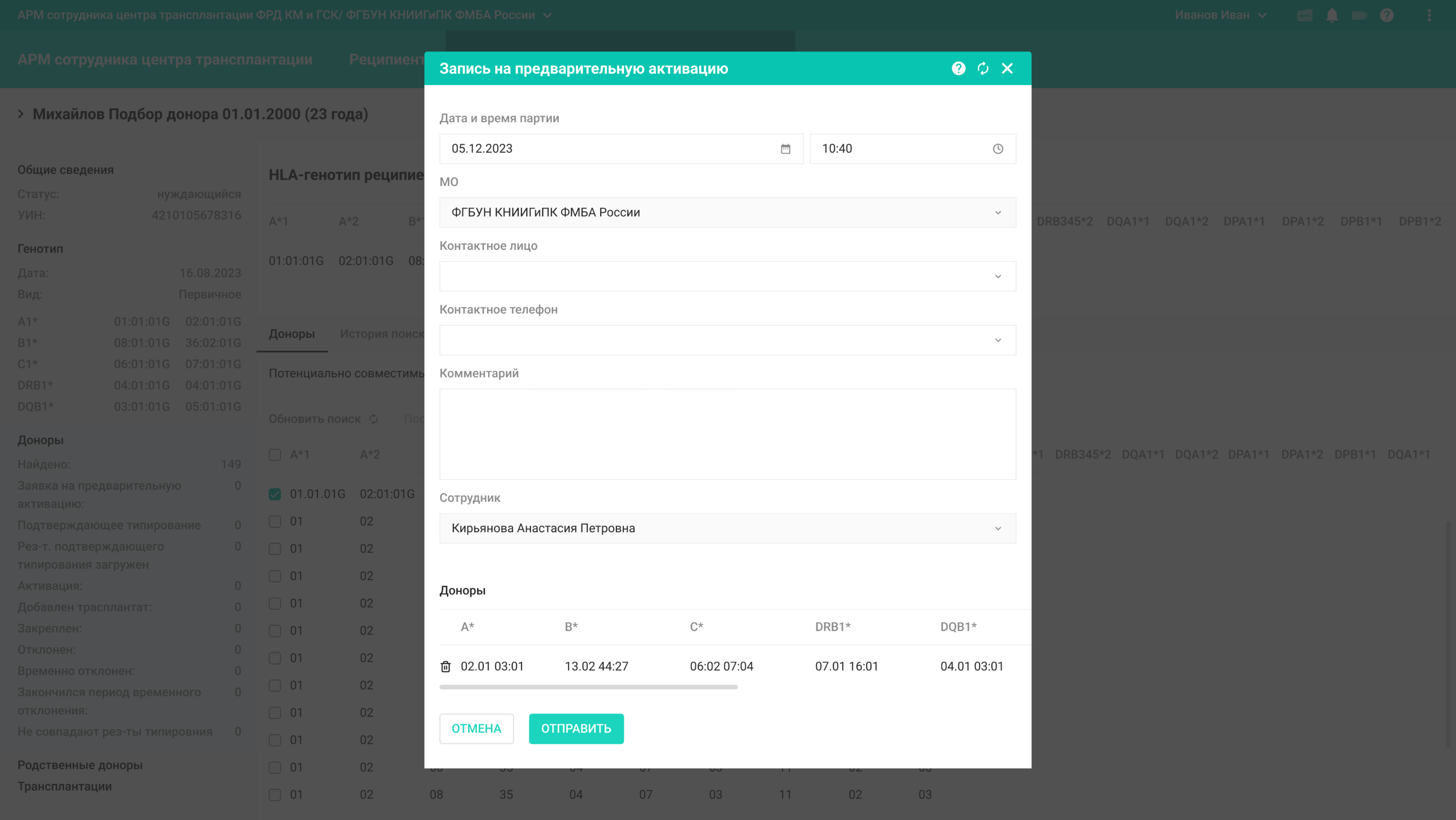 Из списка сотрудники центра трансплантации выбирают подходящих по генотипу, полу и возрасту доноров и создают заявку на предварительную активацию. С этого момента они недоступны для активации для других реципиентов.