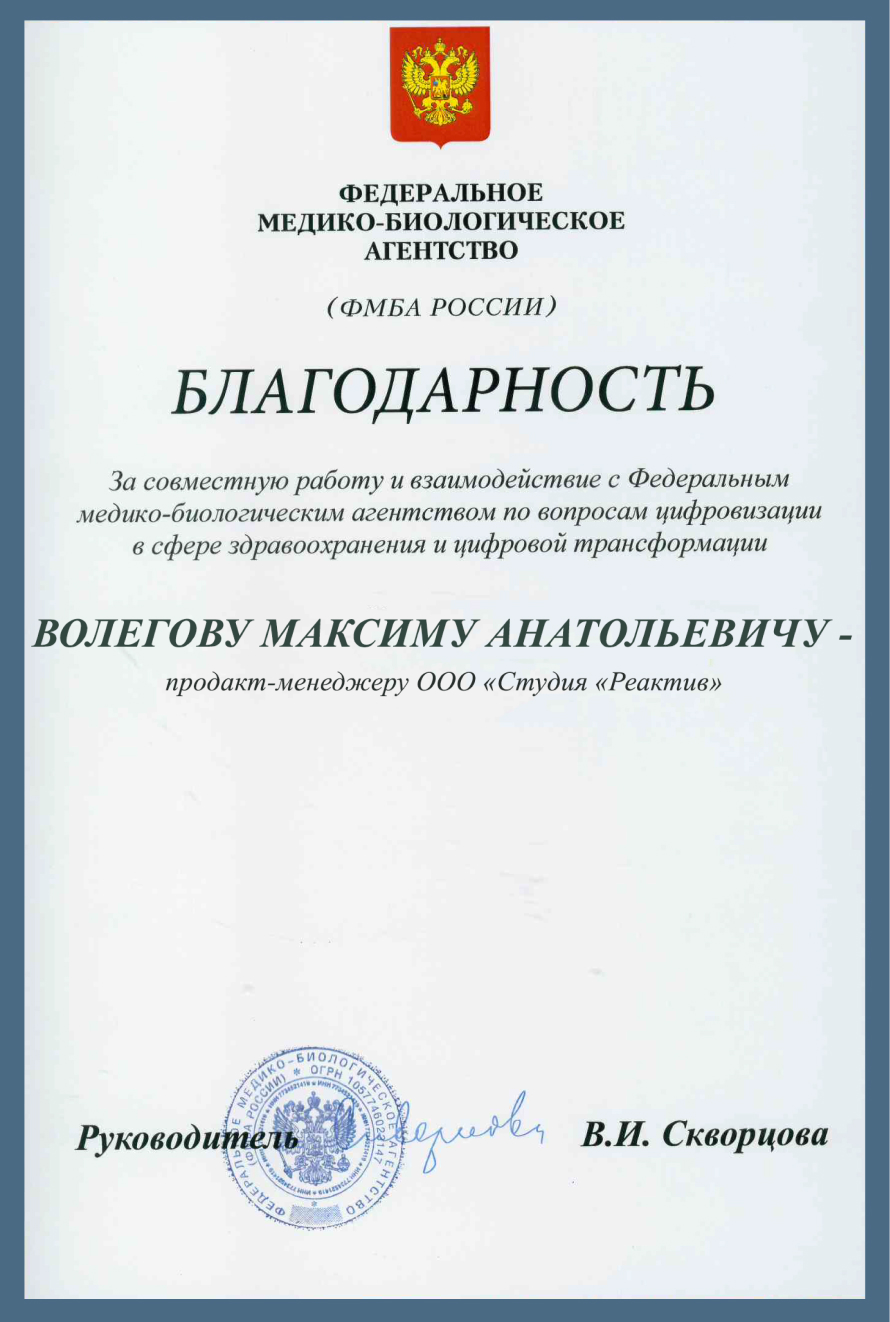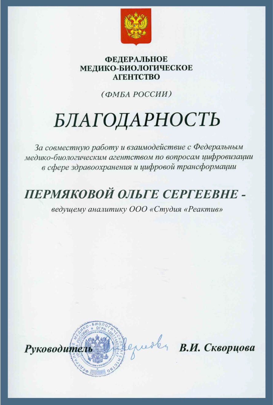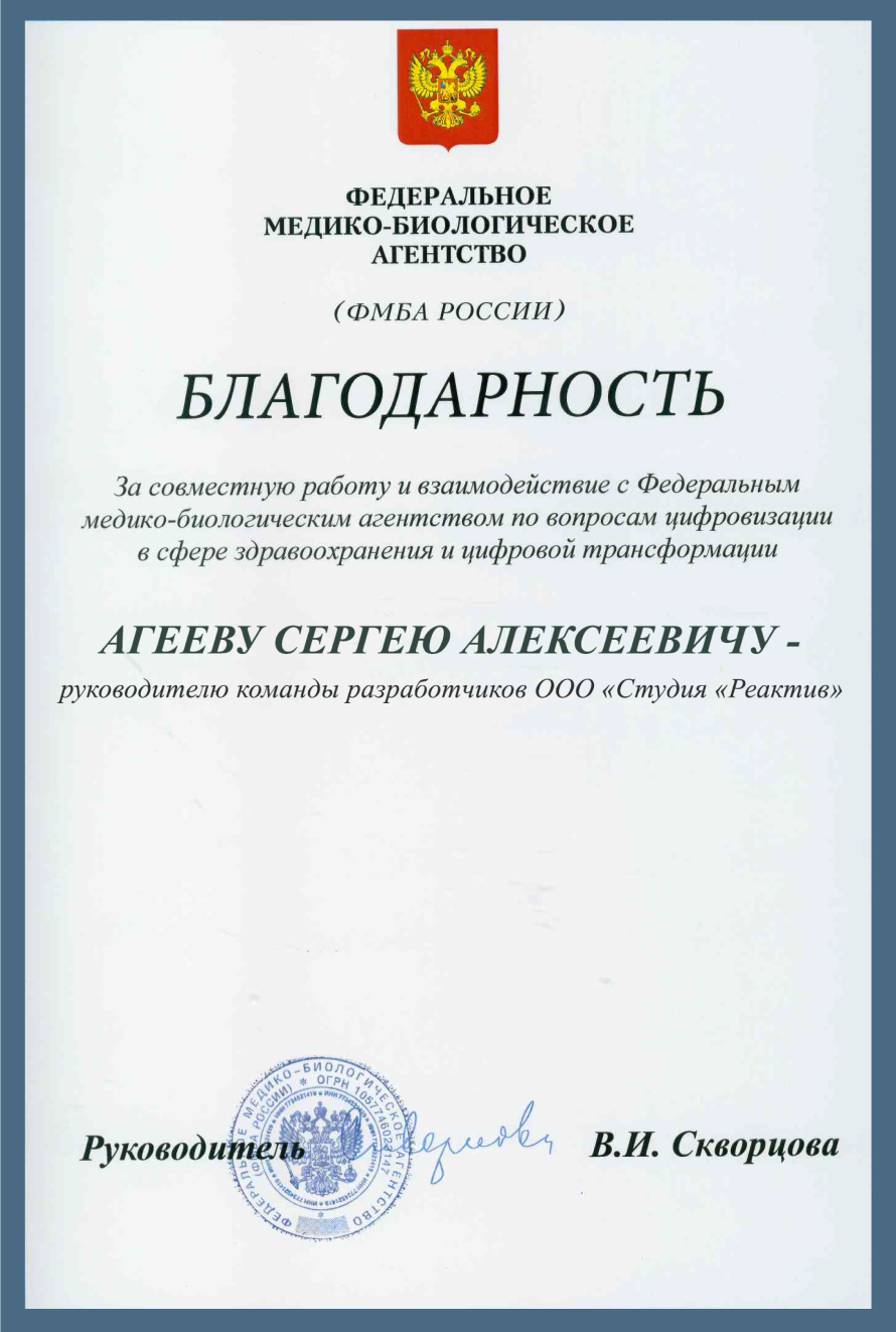 Быть причастным к созданию одного из самых значимых проектов в сфере здравоохранения — наша большая гордость. Федеральное медико-биологическое агентство объявило благодарность специалистам Реактива, которые участвовали в разработке регистра.
