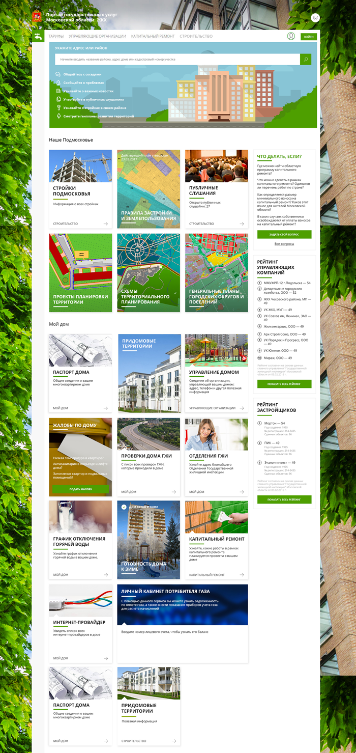 Интересным для реализации стал сервис «Градостроительство и землепользование». В нем пользователь может узнать о планах развития своего города или района, посмотреть генпланы, проекты планировки и другие полезные документы на эту тему. Ему расскажут о узнать о публичных слушаниях, которые будет проходить по этому участку и даже отправить свой вопрос или предложение.