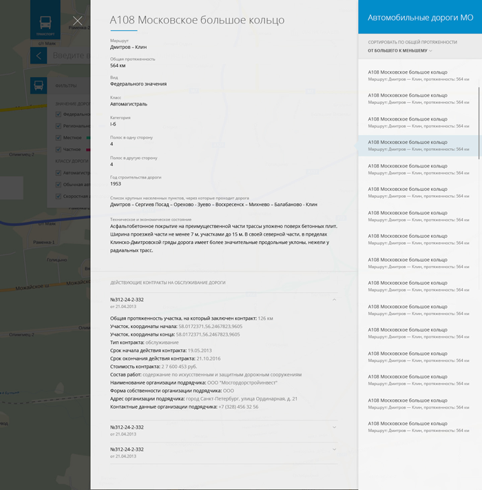 - показали дороги Московской области и подробно рассказали о каждой из них, раскрыли планы администрации по ремонту и отобразили фактическое выполнение работ, показали, как передвигаются по дорогам области ремонтные бригады