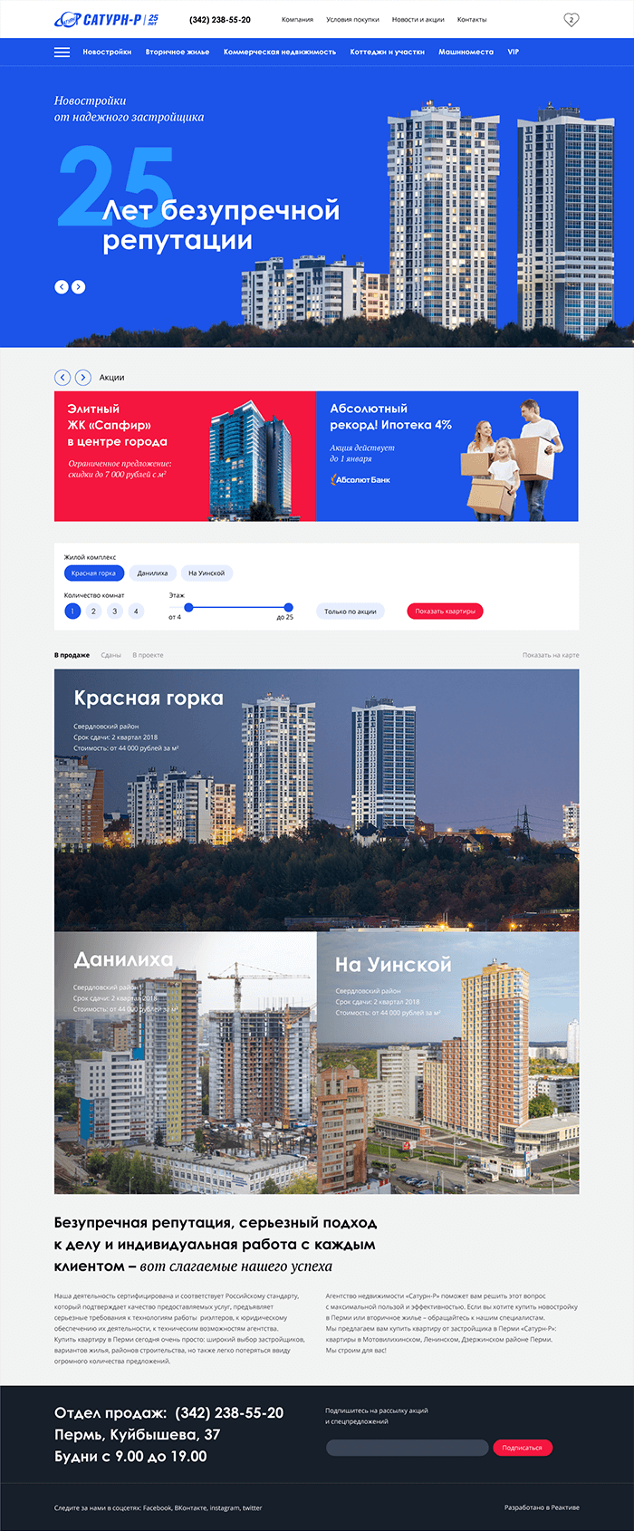 Разработать самостоятельный полноценный сайт большой строительной компании, помогающий продавать квартиры и офисы в новых домах.