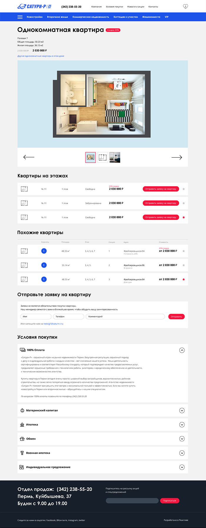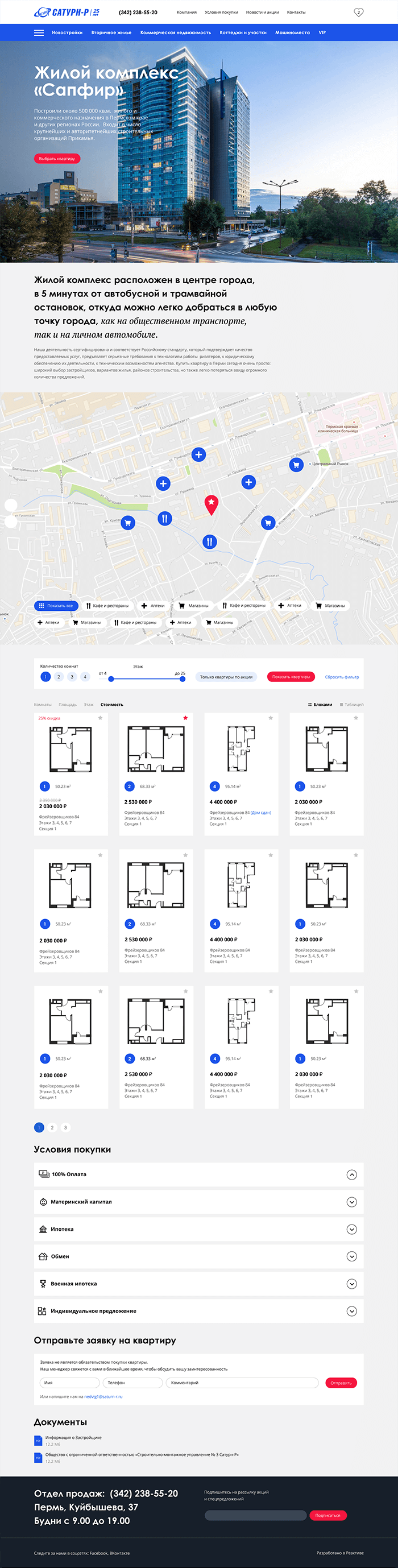 По каждому объекту дано подробное описание, информация об инфраструктуре, список квартир в продаже. Квартиры можно выбрать отфильтровав интересующие вас по множеству разных параметров. Здесь же перечислены важные моменты для покупателя, приложены документы и есть форма, где он может оставить заявку для менеджера по продажам.