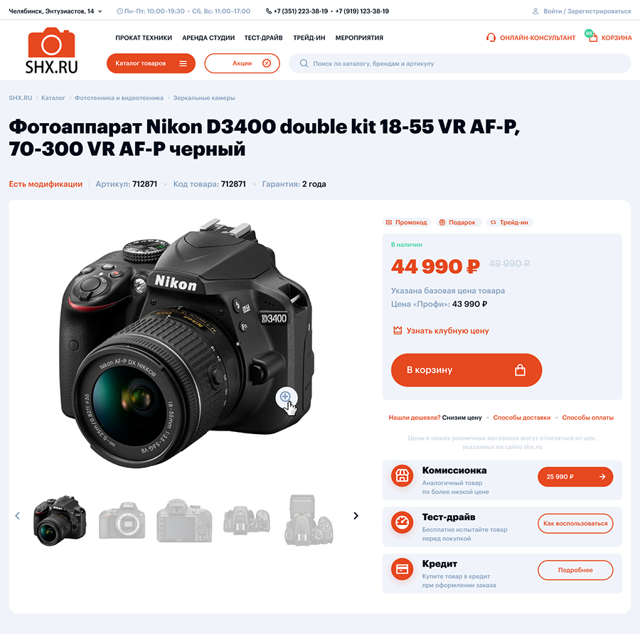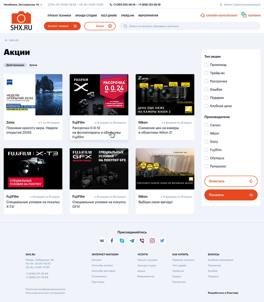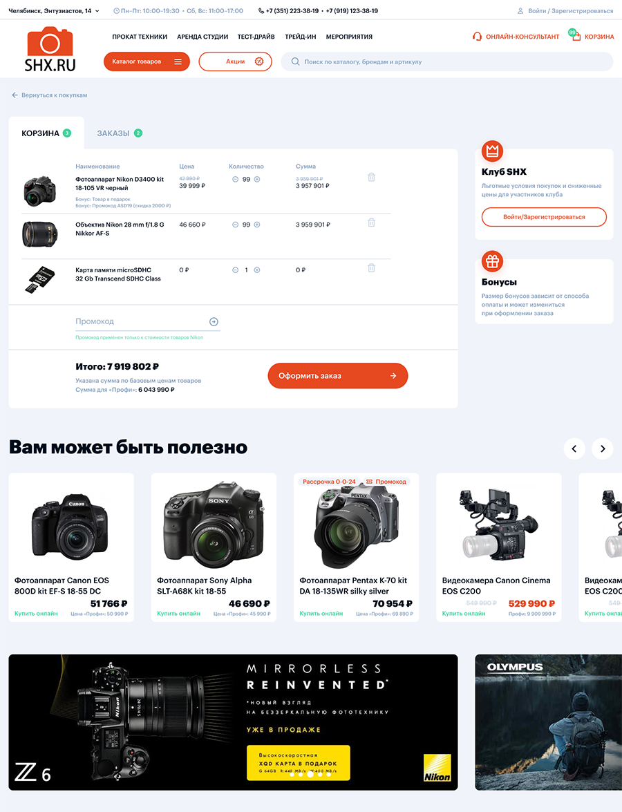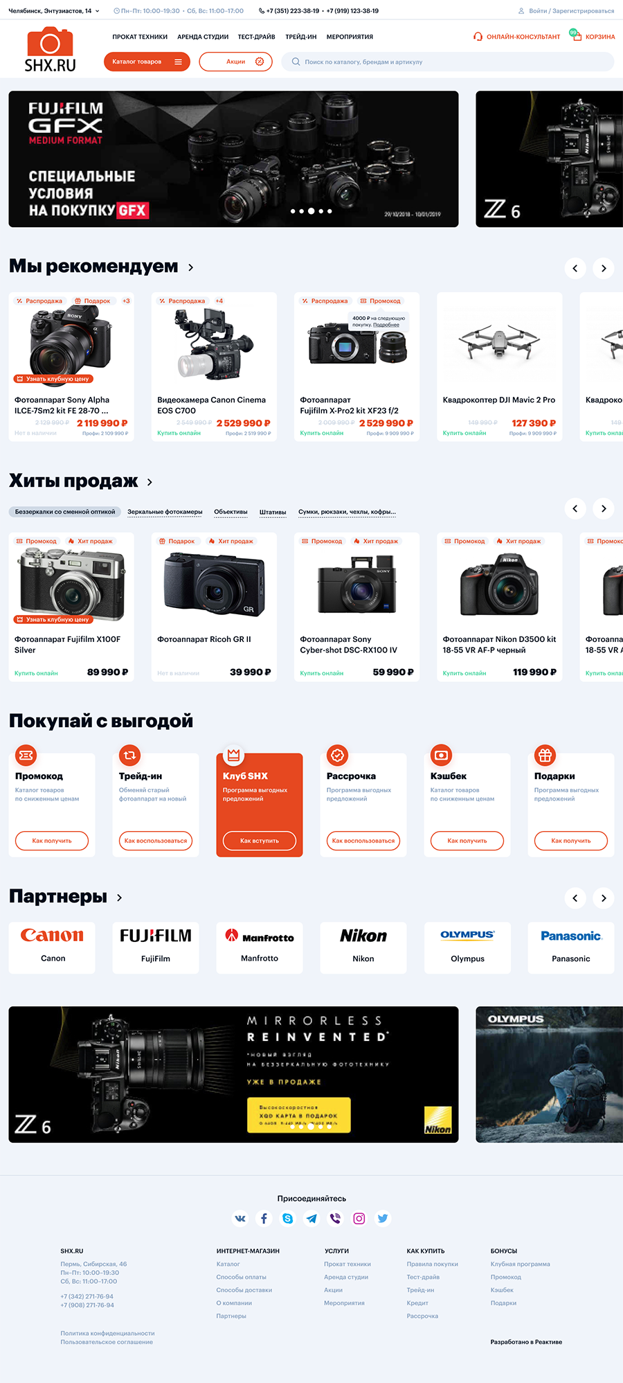 Магазин фото- и видеотехники SHX — один из старейших в Перми и, пожалуй, самый известный для профессионалов в этой области. В момент обращения у компании уже был сайт с каталогом продукции и списком акций и специальных предложений, но делать покупки на нем было невозможно, дизайн устарел, ориентироваться в большом количестве разделов было сложно.