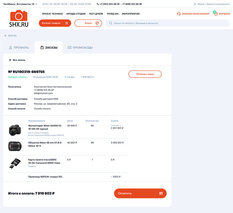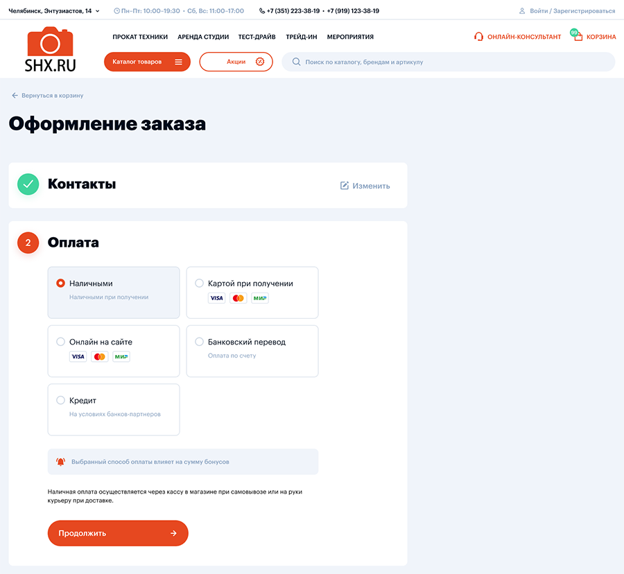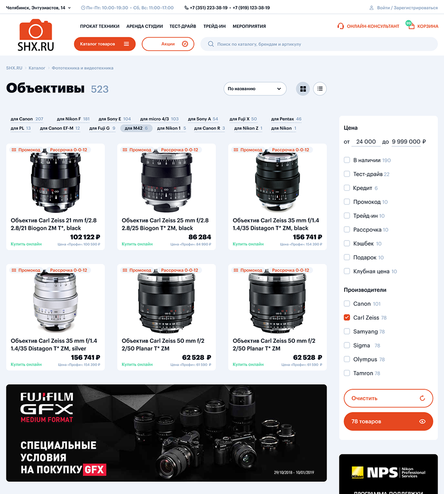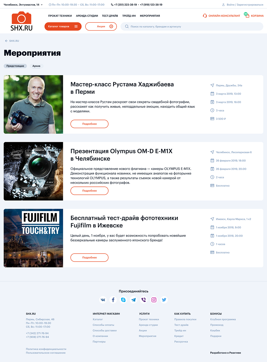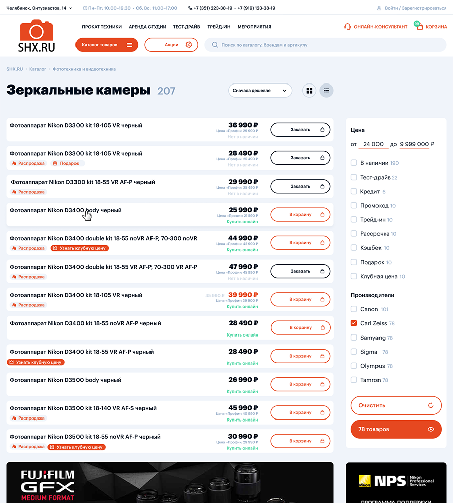 Магазин фото- и видеотехники SHX — один из старейших в Перми и, пожалуй, самый известный для профессионалов в этой области. В момент обращения у компании уже был сайт с каталогом продукции и списком акций и специальных предложений, но делать покупки на нем было невозможно, дизайн устарел, ориентироваться в большом количестве разделов было сложно.