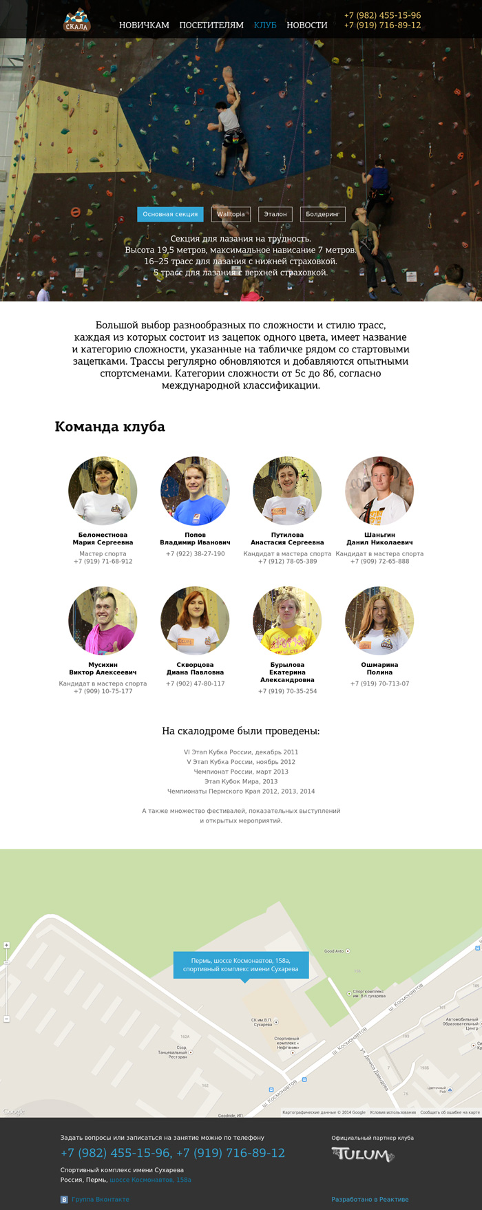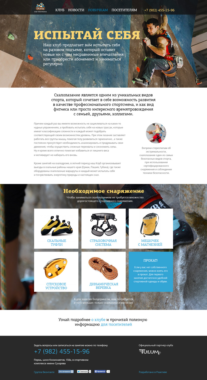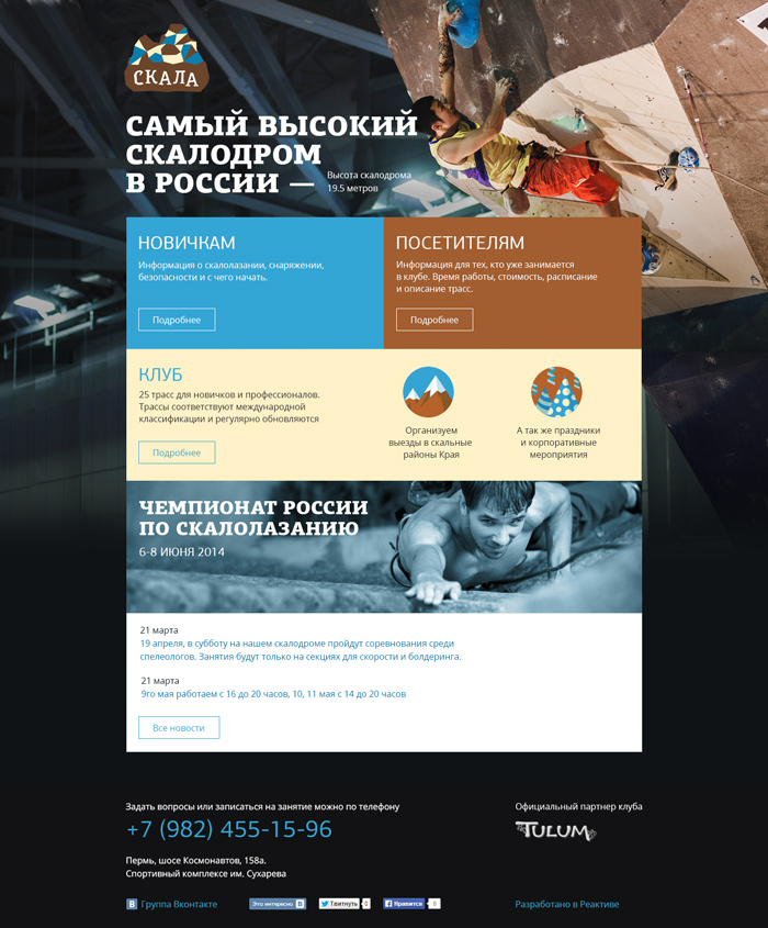 Умные налево, красивые направо. Если серьезно, но на главной странице мы сразу разделили аудиторию на начинающих и продолжающих скалолазов. Первым рассказали про скалолазание как вид спорта, про необходимое снаряжение и безопасность. Вторым про время работы клуба, текущие расценки на посещение и классификацию имеющихся трасс. В разделе о клубе, есть описание всех секций скалодрома, фотографии команды и контактная информация. Сайт собран на базе 1С Битрикс.