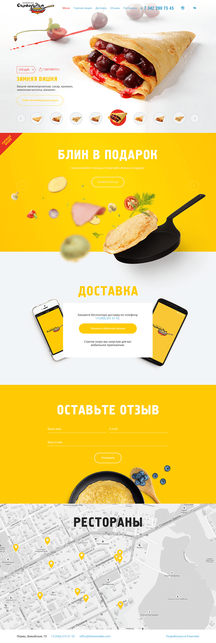 Можно заказать ароматный блин прямо домой, для этого есть форма доставки. Есть информация об акциях. О них мы рассказываем так же сочно, как и обо всем остальном. Блинной интересно, что думают о них посетители. Для сбора отзывов на сайте предусмотрена удобная форма для отзывов.