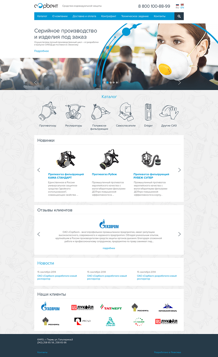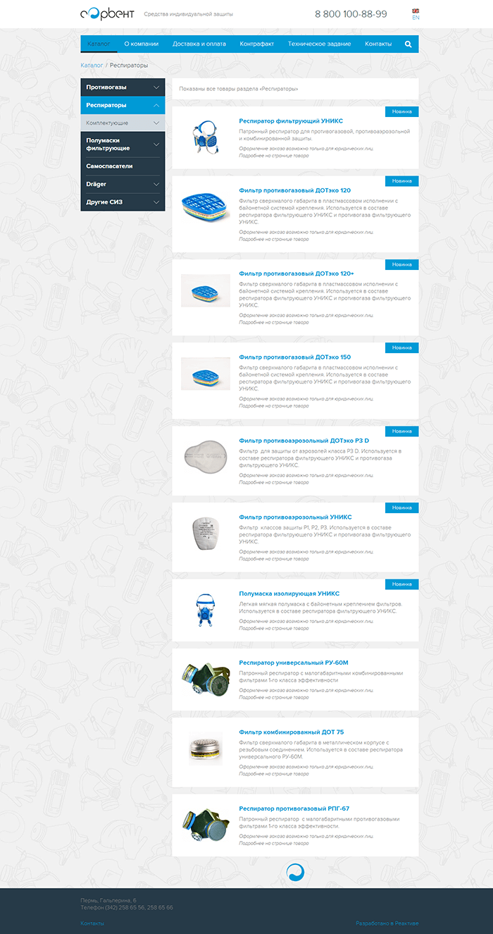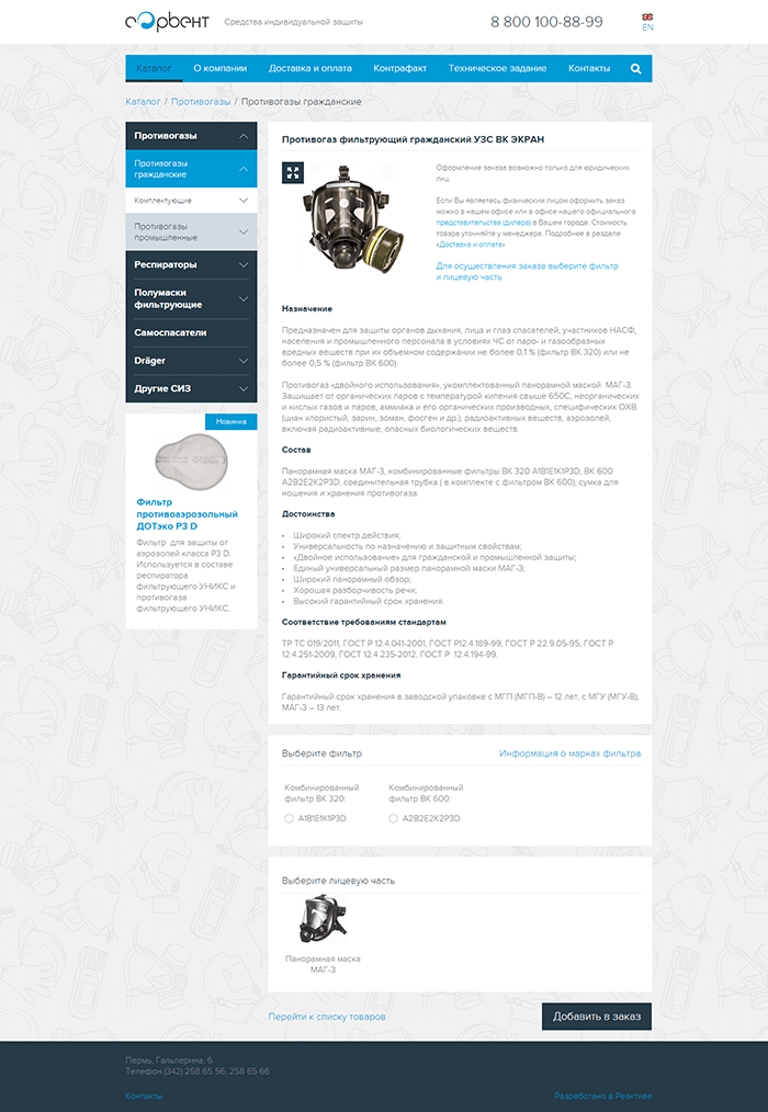 Каждый товар в каталоге может иметь дополнительные для заказа опции, так например заказывая противогаз покупатель имеет возможность выбрать необходимый фильтр и отдельно лицевую часть. Система подсказывает, если комплект еще не собран и предлагает варианты сборки Заказ отправляется на почту сотруднику компании, отвечающему за регион заказчика. Проект собран на базе CMS 1С Битрикс в редакции «Малый бизнес».