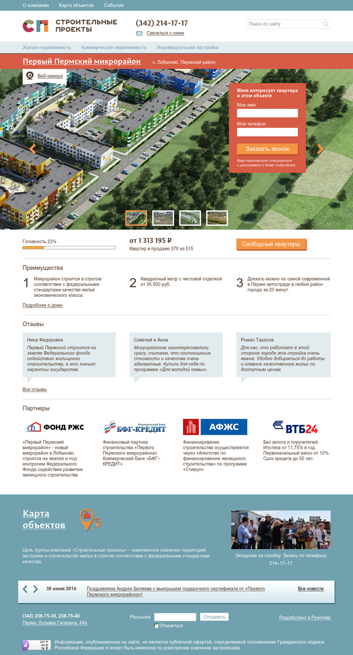 Компания «Строительные проекты» наш давний клиент. За 2 года работы первой версии сайта изменилась стратегия работы компании, поэтому назрела необходимость изменений на сайте. Компания стала ориентироваться на строительство собственных объектов. Новый сайт должен продавать квартиры, коммерческую недвижимость и проекты индивидуальной застройки.