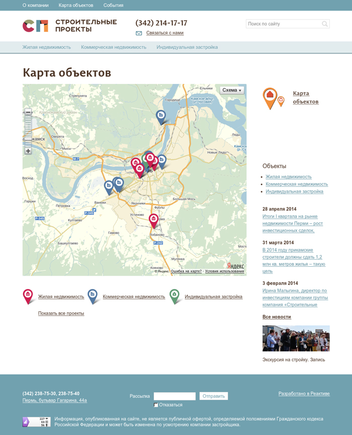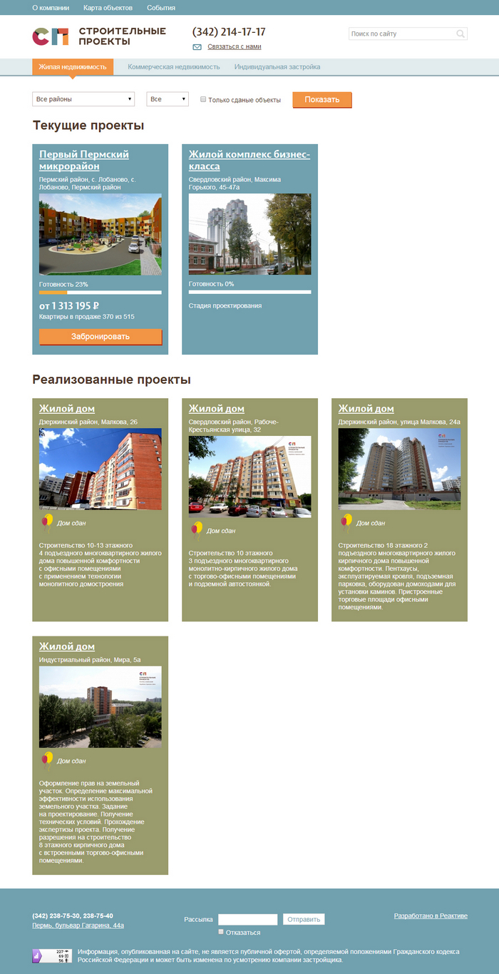 Так как целевая аудитория сайта сменилась с b2b на b2c нам пришлось убрать разделы об услугах для юридических лиц, раздел для инвесторов и раздел про тендеры. Однако, раздел с проектами был проработан и расширен. Теперь в нем три части: жилая недвижимость, коммерческая недвижимость, индивидуальная застройка.