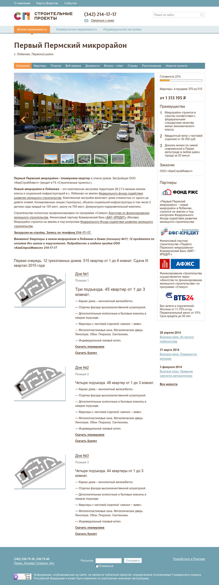 По каждому проекту есть подробная информация: описание, фотографии, схемы, цены, планировки, буклеты, разрешительная документация. Каждую квартиру можно забронировать. Текущее состояние проекта можно узнать посмотрев веб камеры со стройки. Можно задать интересующий вопрос. Появилась информация о партнерах компании и отзывы клиентов. Есть возможность отслеживать новости по каждому из проектов.