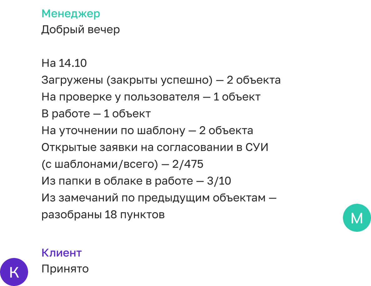 А ежедневный отчёт о работе менеджера выглядит проще и реализован через чат с заказчиком.