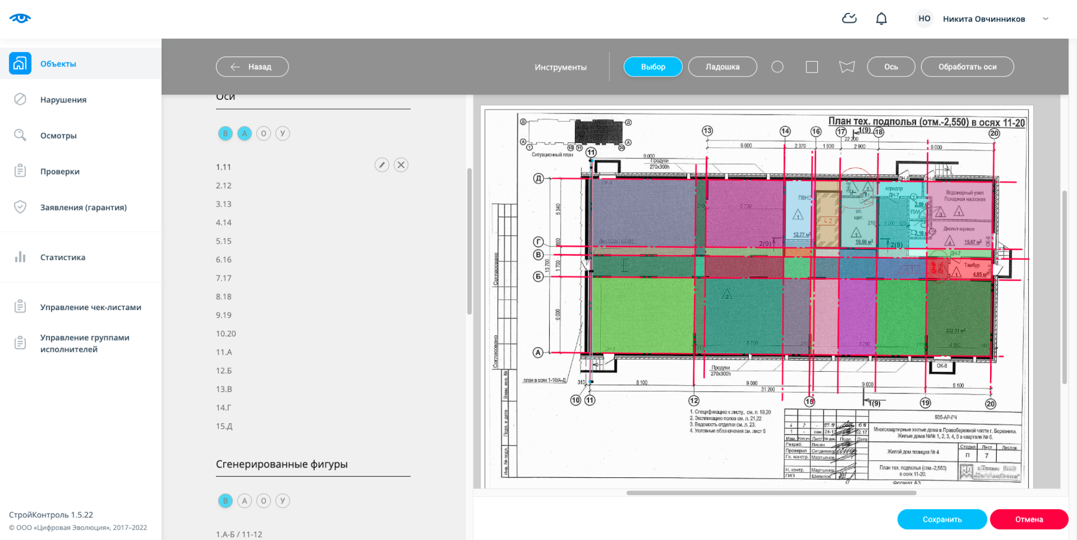 Подробнее о разметке. У каждого объекта строительства в подсистеме «СтройКонтроль» есть план помещений, который нужен надзорным органам для проведения проверок и выявления нарушений при строительстве. Наша задача — загрузить чертежи в систему и нанести на них разметку для автоматического распознавания осей в рамках локализации места нарушения.