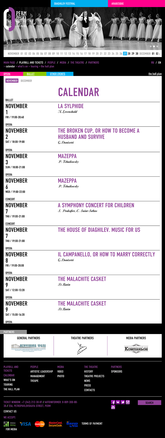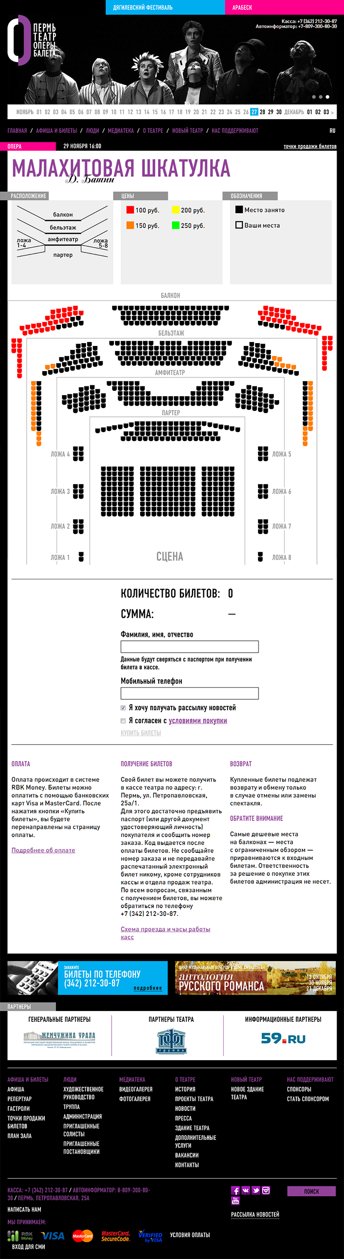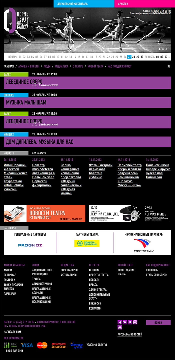 Мы реализовали интеграцию с билетной системой. Заказать и купить билеты на спектакли можно прямо на сайте. Оплата реализована с помощью платежной системы RBK Money. Сайт собран на фреймворке Yii. Есть версия на английском языке. Дизайн сайта разработан компанией Zoloto Group.