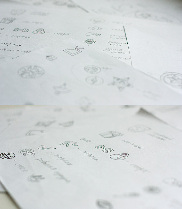 Рисуем множество карандашных эскизов, ищем идеи и согласуем метафоры с клиентом.