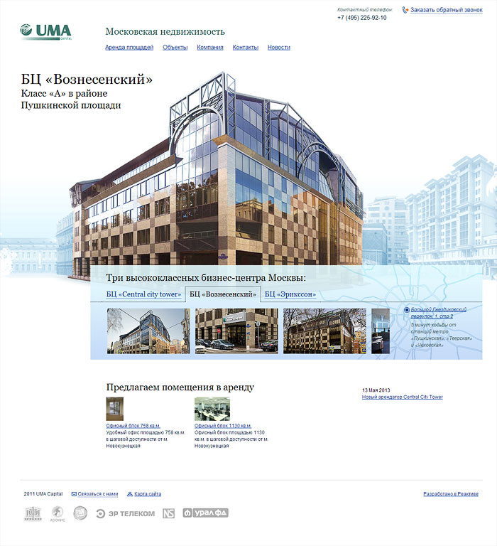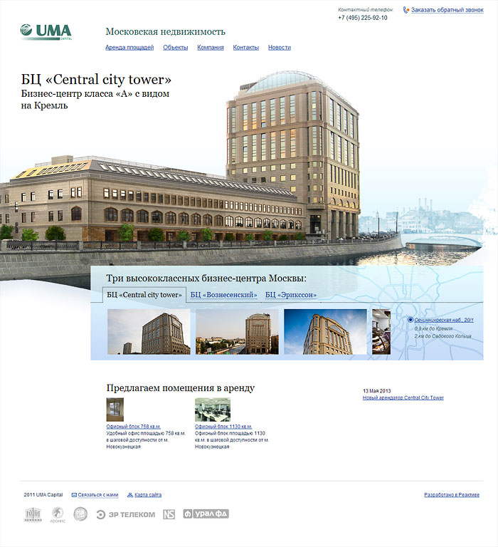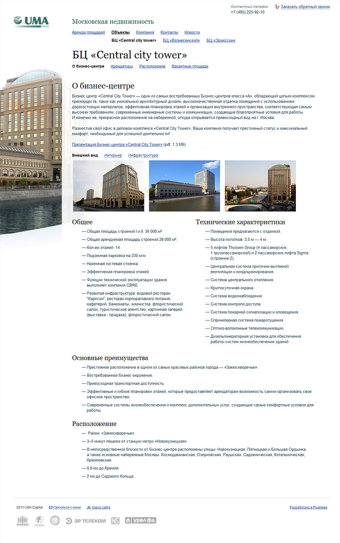 Мы показали обслуживаемые здания. Свободные площади, расположение офисных центров, их описание, информацию об арендаторах. Информация об управляющей компании и её услугах.