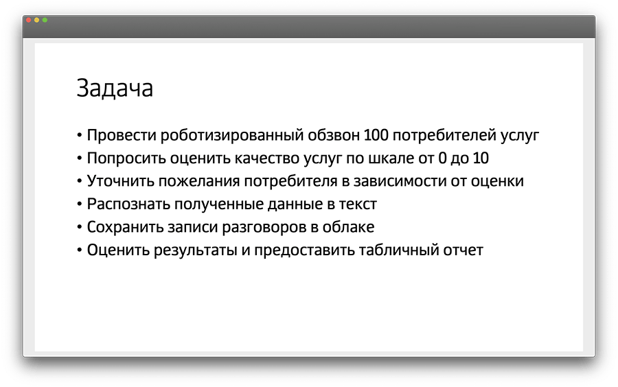 Робот просил оценить качество услуг компании по шкале от 1 до 10 и высказать свои замечания или пожелания. Для ввода оценки использовалась клавиатура устройства пользователя, а записанный голос распознавался нашим сервисом, преобразовывался в текст и сохранялся в облаке.