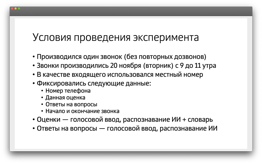 Обзвон базы клиентов происходил в согласованное с заказчиком время — утром рабочего дня. С местного номера телефона, соответствующего региону проживания абонента, звонили каждому человеку всего один раз, без повторных попыток.