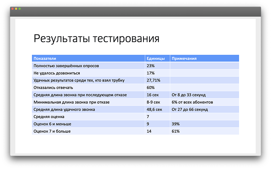 Некоторые абоненты брали трубку, некоторые — нет, некоторые не доводили разговор до конца. Мы собрали полную статистику каждого звонка (его успешность, длительность), поведения и реакции пользователей, полученные оценки и голосовые записи, проанализировали эти данные и предоставили клиенту в виде отчета.