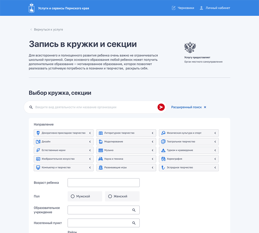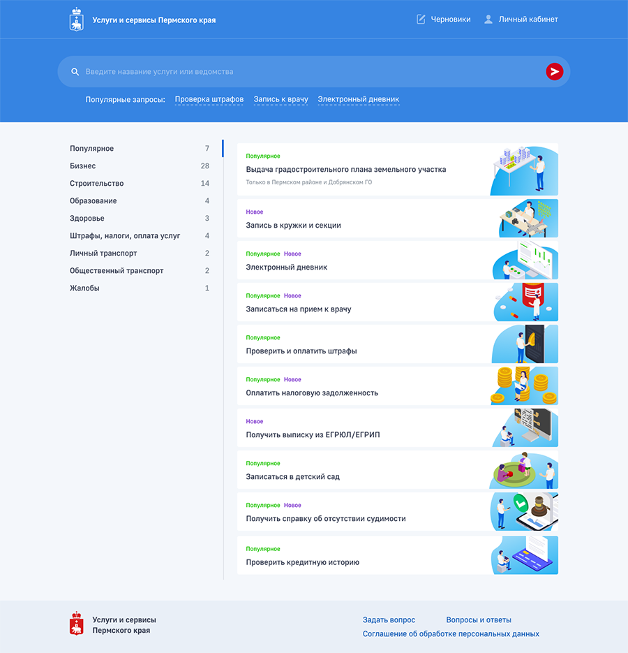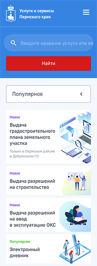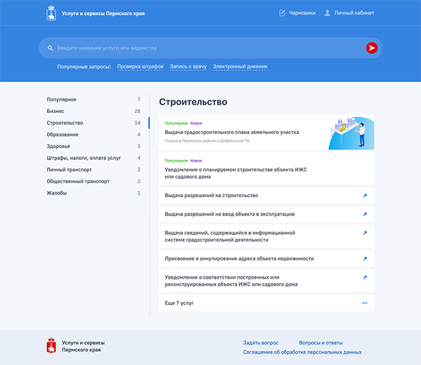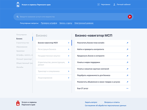 Центром внимания пользователя портала стал каталог всех услуг, которые можно получить на территории края, и поиск по нему. В структуру каталога вошли не только пермские, но и федеральные услуги, популярность которых очень велика. Для таких предусмотрен переход на общероссийский ресурс с возможностью их получения на более высоком уровне.