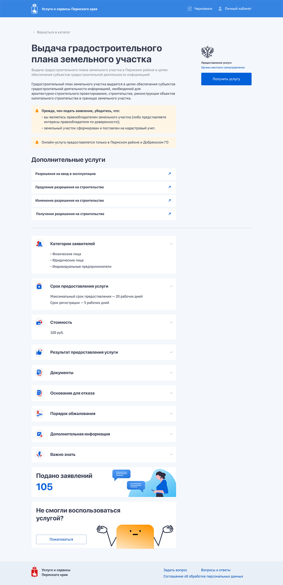 На странице услуги представлена основная информация о ней (сроки, стоимость, категории заявителей, документы и т.п.) и возможность перейти к заполнению заявления на получение услуги в электронном виде.
