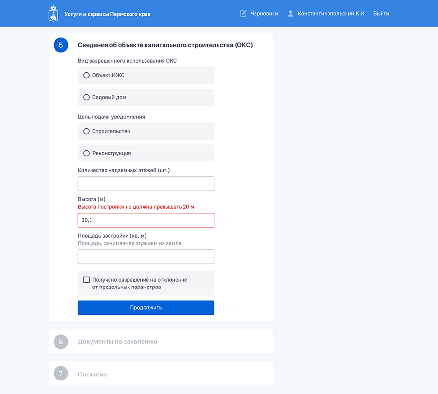 Формы заявлений — это, пожалуй, самое интересное, ведь все услуги разные (от получения разрешения на строительство до записи ребенка в первый класс), а нам очень хотелось, чтобы процесс работы с формой был как можно более универсальным, понятным и удобным. Для каждой услуги были выделены основные структурные блоки, а затем выстроена общая логика заполнения форм: сначала выбор вариантов получения услуги в рамках предоставляемых возможностей (в самых разных видах: от специально реализованного по параметрам поиска до выбора объекта заявления на интерактивной карте), затем личные данные, заполнение всех специальных данных, необходимых именно для этой услуги, загрузка документов и общее согласие с условиями предоставления услуги.