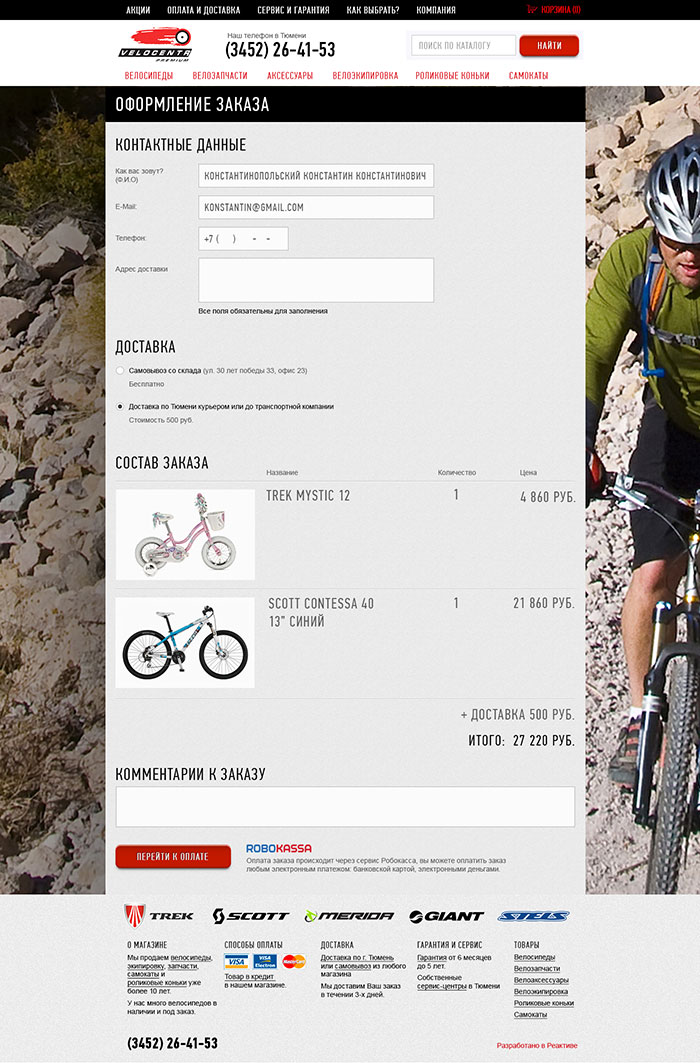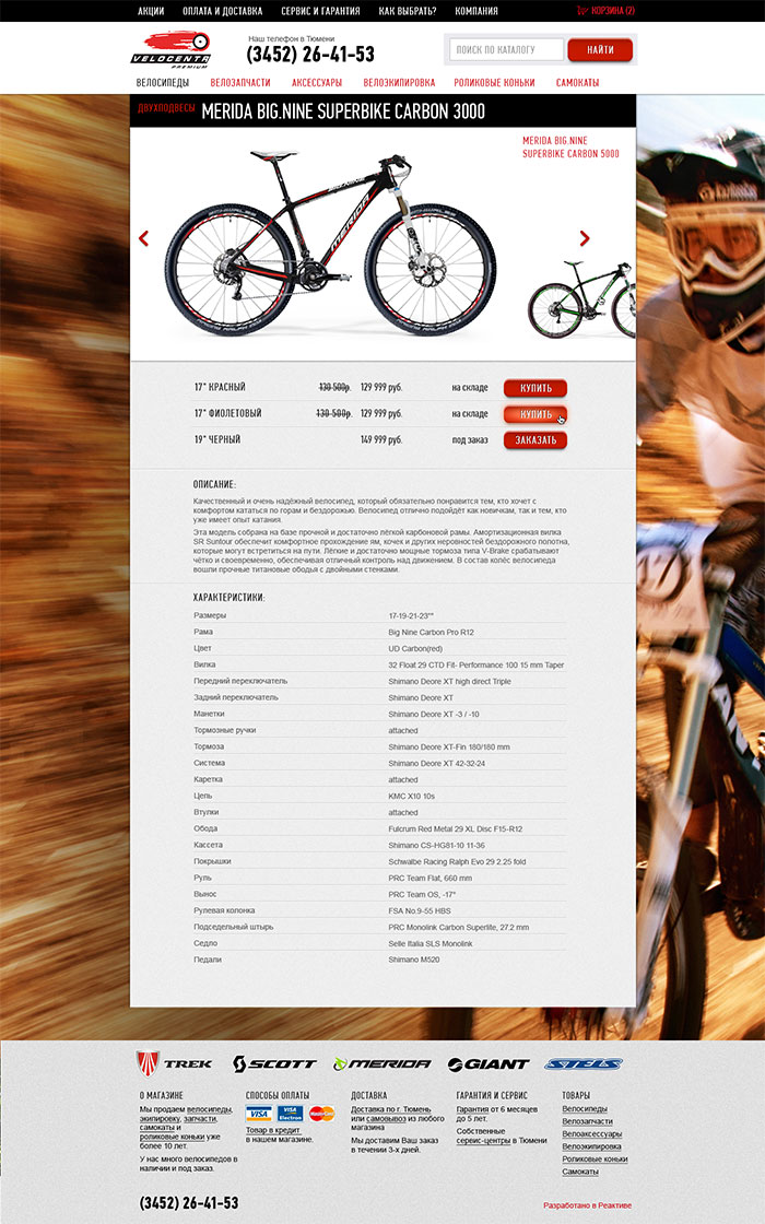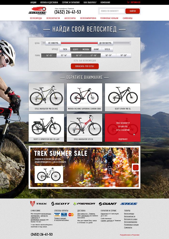 Как обычно работа над проектом началась с прототипа. На сайте есть удобный визард для выбора велосипеда. Администратор может опубликовать на главной странице самые горячие предложения. Для каждого товара предлагаются варианты дешевле и дороже.