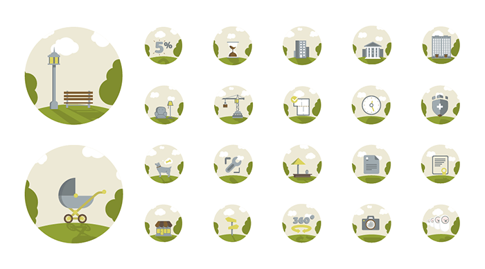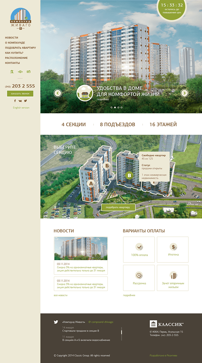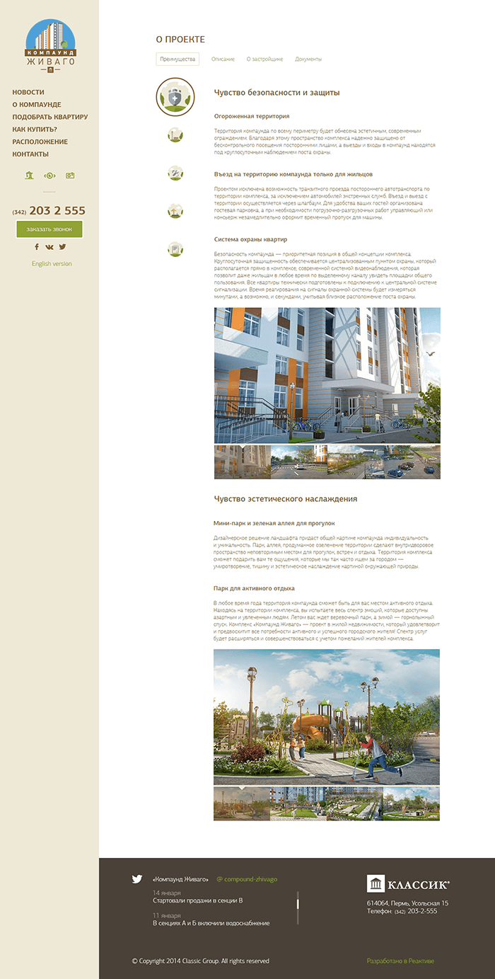 Стартовая страница сайта — это большие изображения будущего жилого комплекса и ёмкие тезисы. Дальше мы объясняем что такое компаунд, говорим о преимуществах, особенностях, даем информация о застройщике и официальные документы.