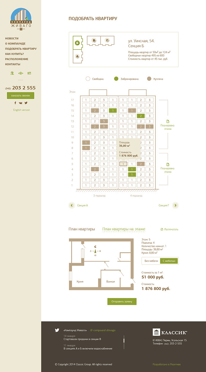 Тем кто заинтересовался, предназначены материалы о расположении домов, планировки квартир, цены, показаны какие квартиры уже проданы, а какие нет. Дана контактная информация офиса продаж, есть форма заказа звонка и установлен чат.